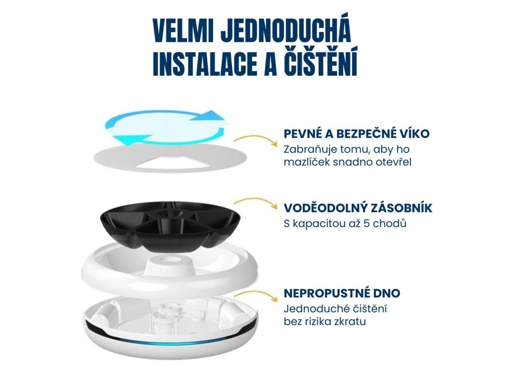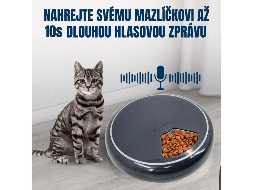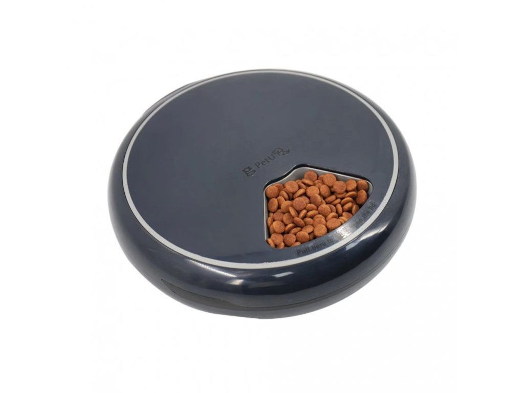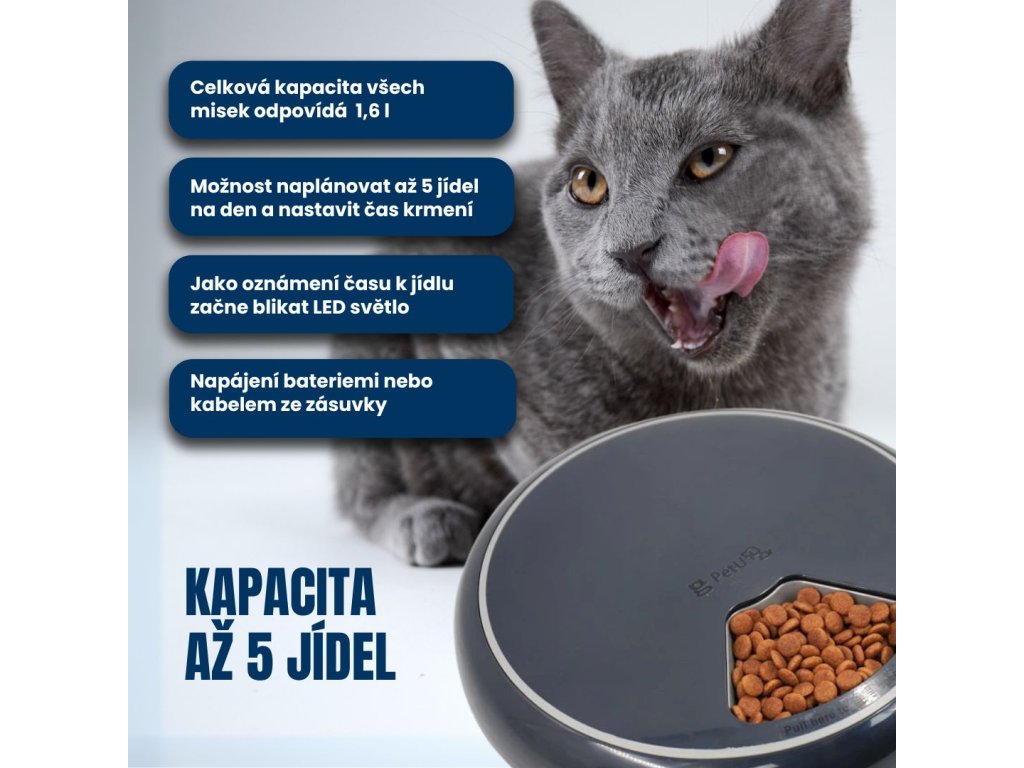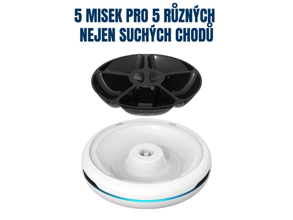 Automatyczny dozownik karmy zawierający 5 misek z możliwością napełniania nie tylko suchą karmą, komunikat głosowy 10 s, pojemność całkowita 1,6 l, kolor czarny