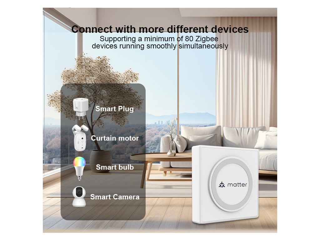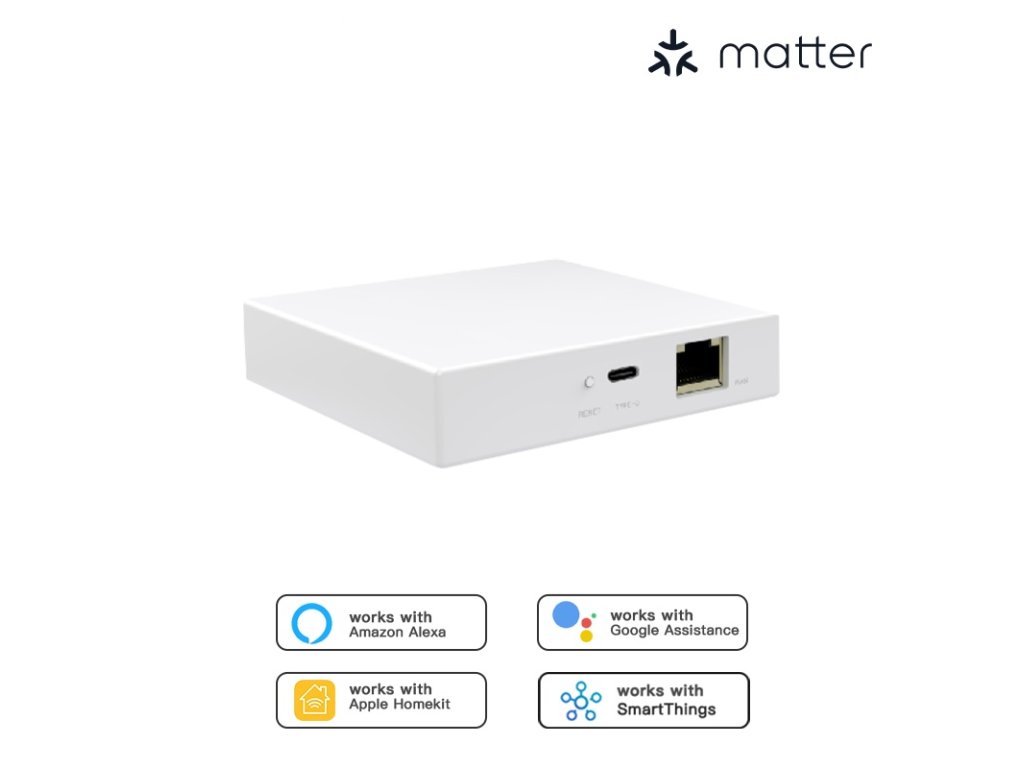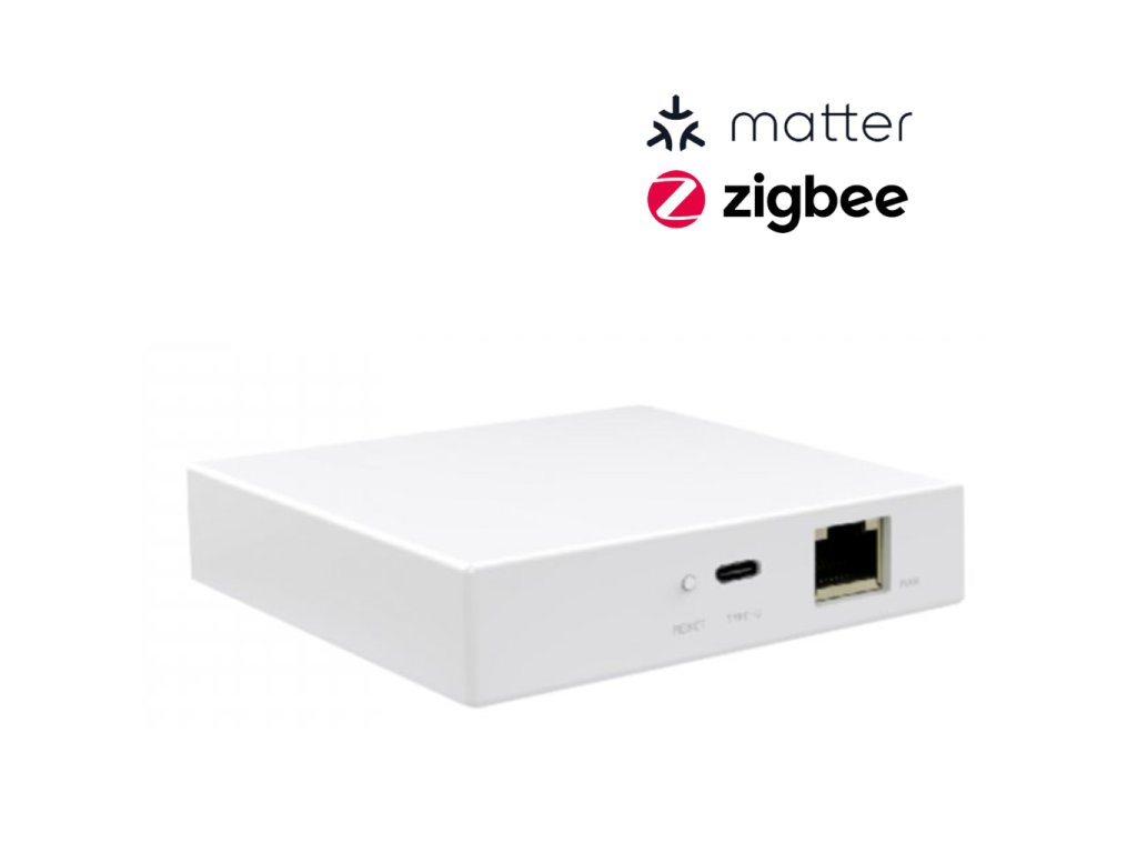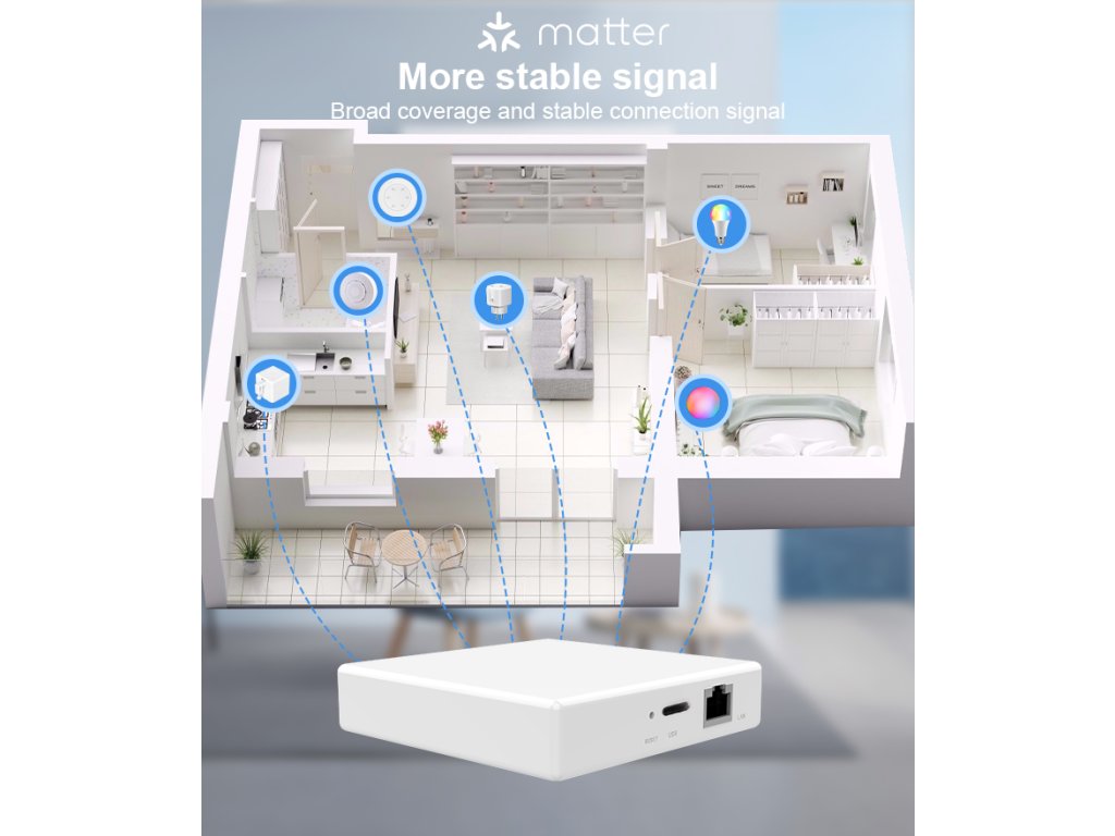 Inteligentna bramka (gateway), Matter, ZigBee, służąca do sterowania inteligentnym domem, aplikacja mobilna na systemy Android i iOS, kompatybilna z Google Home i Amazon Alexa, zasilanie sieciowe, kolor biały.