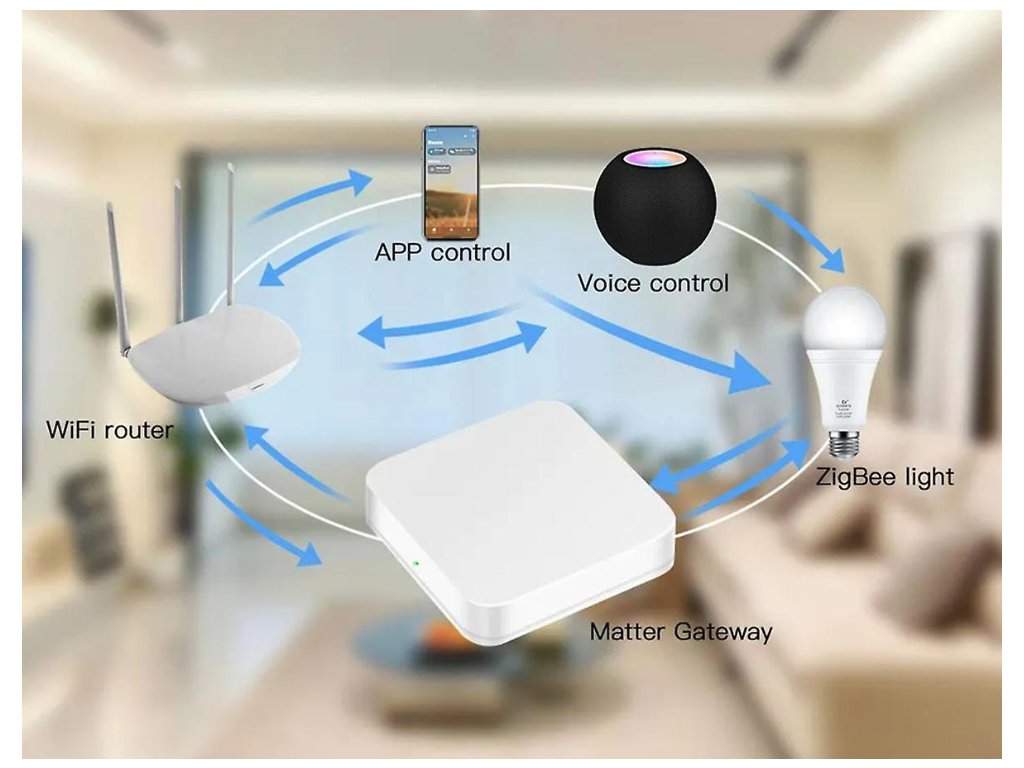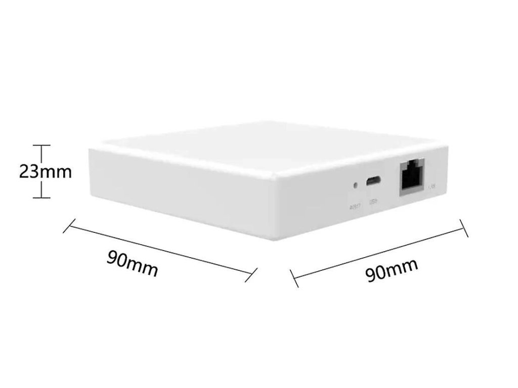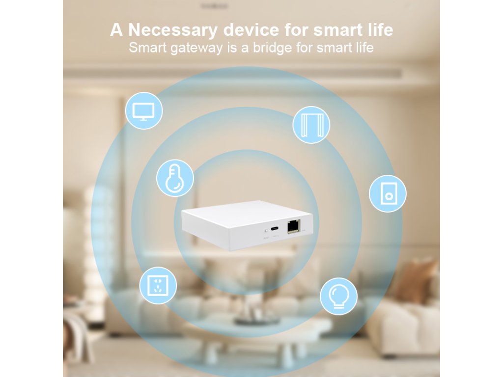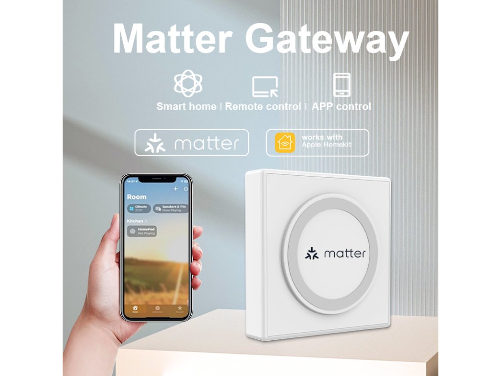 Inteligentna bramka (gateway), Matter, ZigBee, służąca do sterowania inteligentnym domem, aplikacja mobilna na systemy Android i iOS, kompatybilna z Google Home i Amazon Alexa, zasilanie sieciowe, kolor biały.