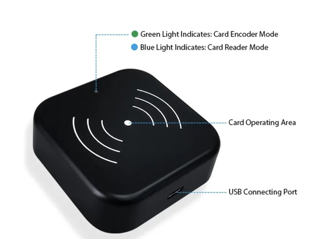 Czytnik do odczytu i zapisu kart inteligentnych do systemu TTLock i TTHotel, RFID, częstotliwość 13,56 MHz, aplikacja mobilna TTlock, Bluetooth, odpowiedni do stosowania w hotelach.