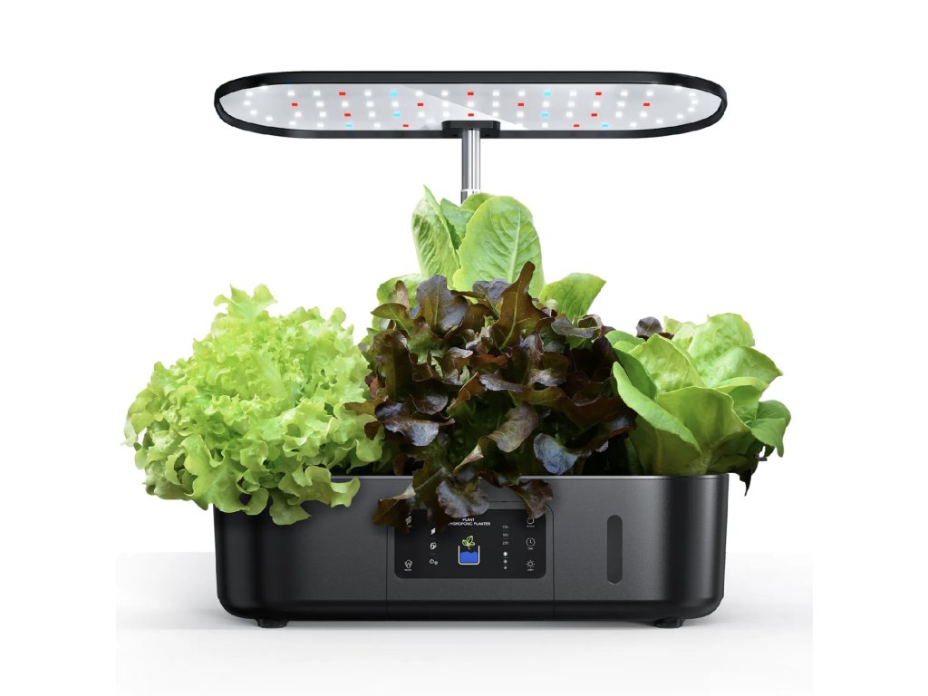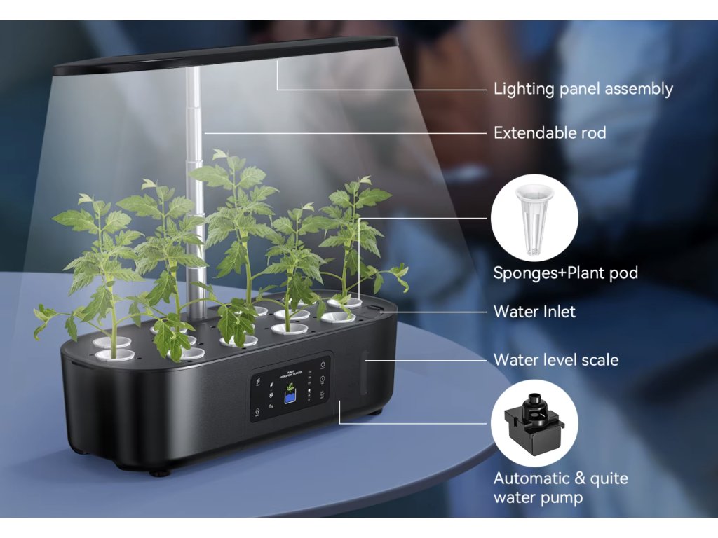 Inteligentna doniczka z wyświetlaczem, cyrkulacją wody, regulowaną wysokością lampy, do uprawy hydroponicznej, czarny design.