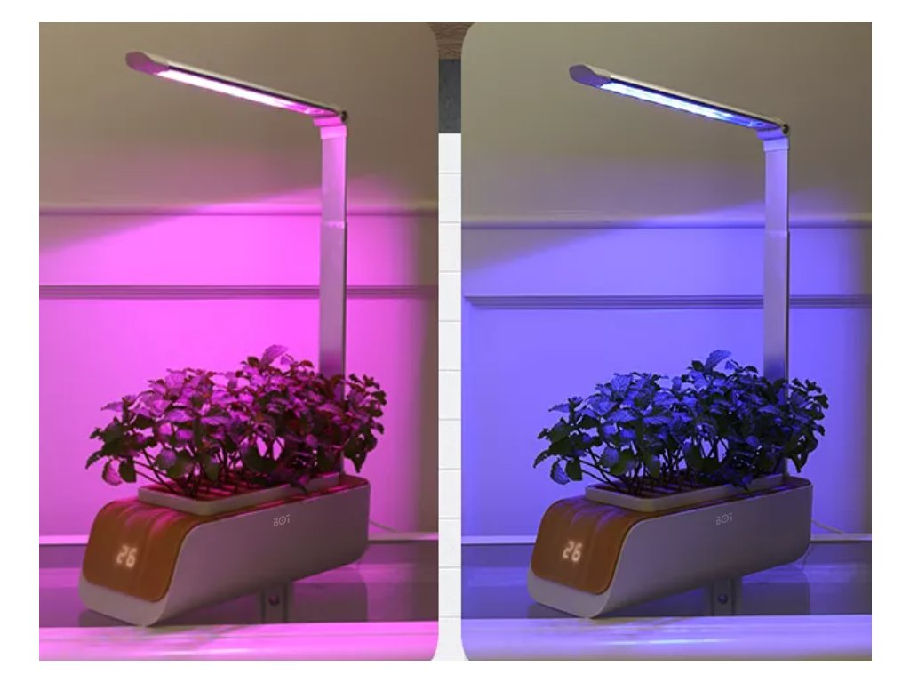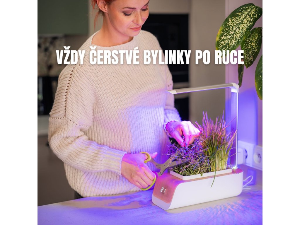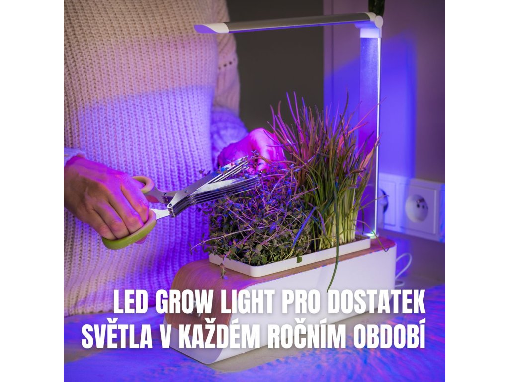 Ta doniczka to mała skrzynka z wbudowanym oświetleniem i systemem nawadniania, w której możesz uprawiać niesamowitą różnorodność roślin, kwiatów, ziół i warzyw. Skrzynka mieści 2 pojemniki na nasiona, dzięki czemu możesz sadzić wiele roślin w jednej doniczce. Jest zaprojektowana tak, aby nawadniać nasiona i utrzymywać wystarczającą ilość wody, aby zapewnić im odpowiednie podlewanie przez około miesiąc. Dostępna jest specjalna lampa LED do uprawy, której wysokość można zwiększać w miarę wzrostu roślin.