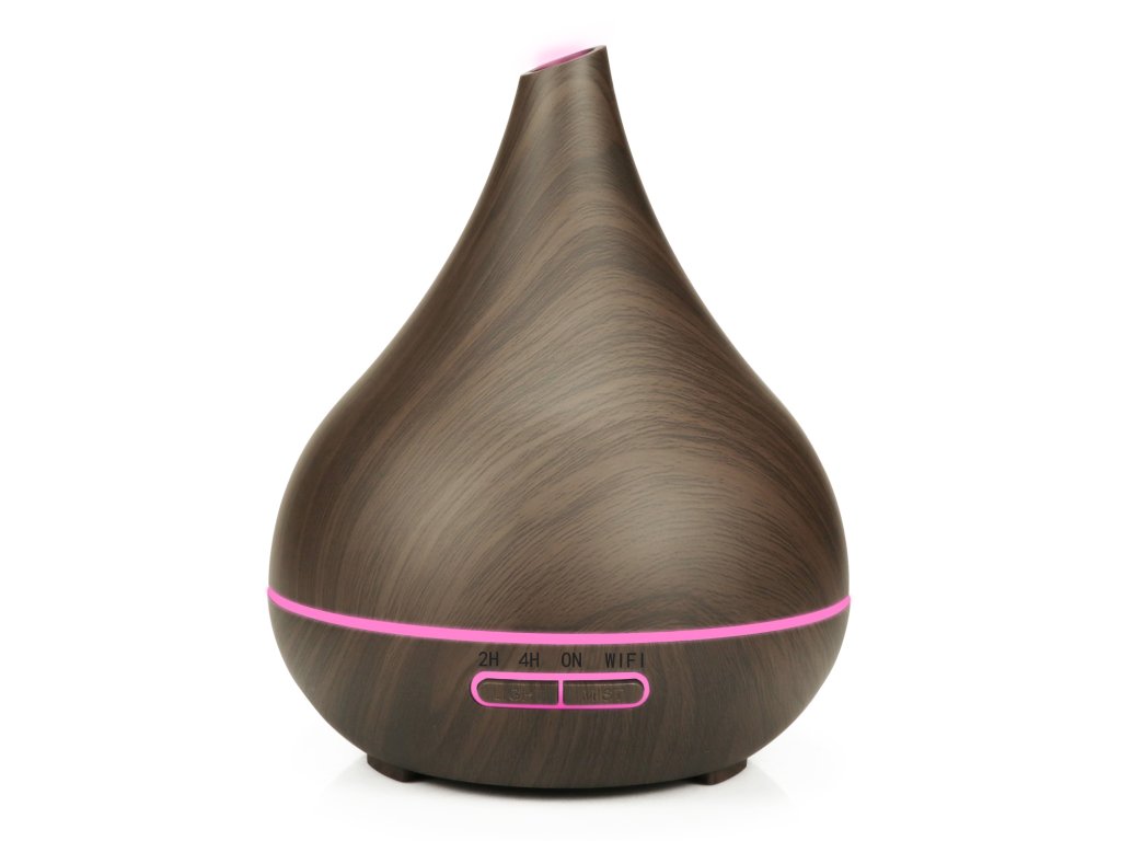 dyfuzor zapachowy sterowany przyciskami, pojemność pojemnika 400 ml, 7 kolorów podświetlenia, czas działania 12 godzin, podświetlenie, kolor ciemnobrązowego drewna