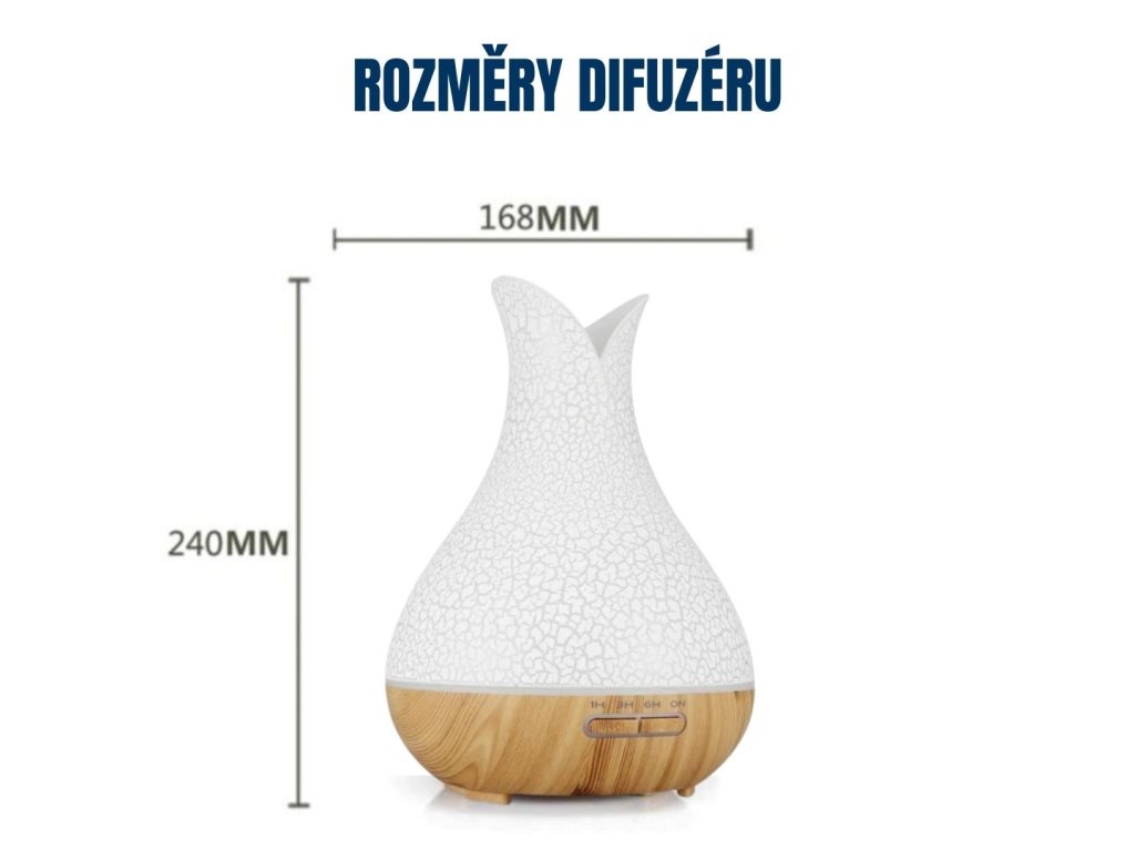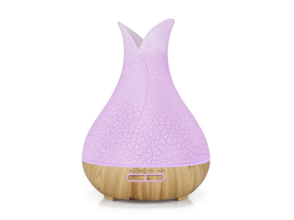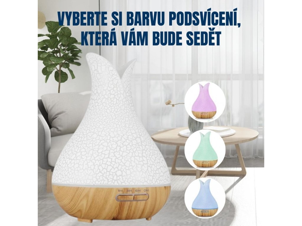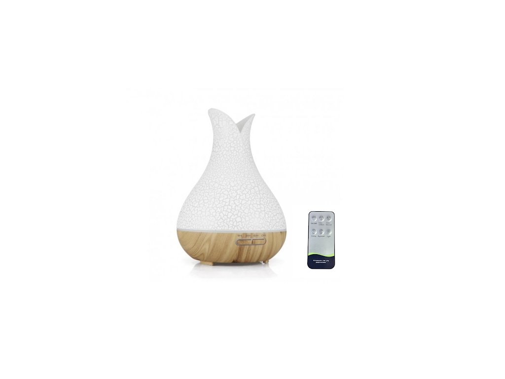 Dyfuzor zapachowy, pojemność pojemnika 400 ml, 7 kolorów podświetlenia, czas działania 12 godzin, sterowanie za pomocą pilota i przycisków na dyfuzorze, włączanie i wyłączanie za pomocą timera, kolor: biały i jasnobrązowe drewno.