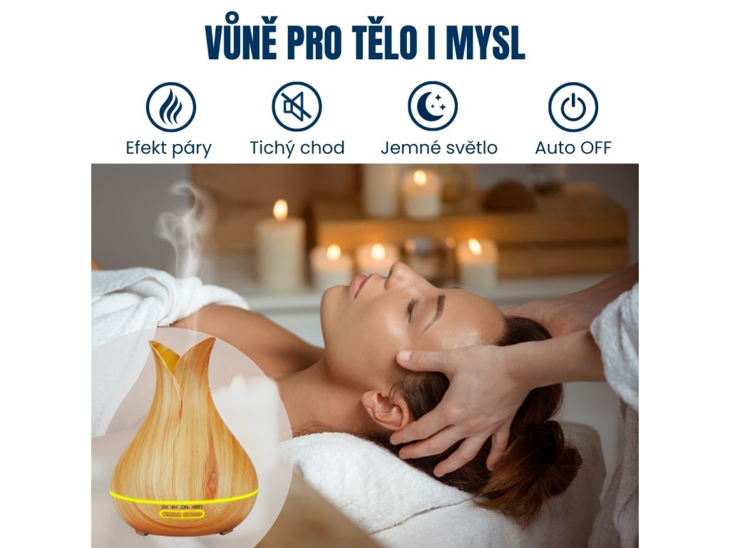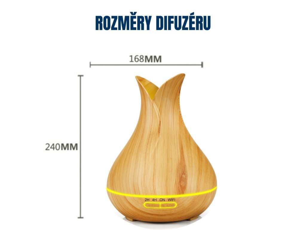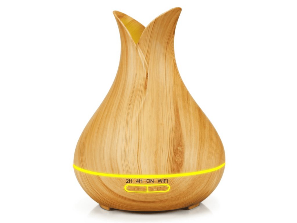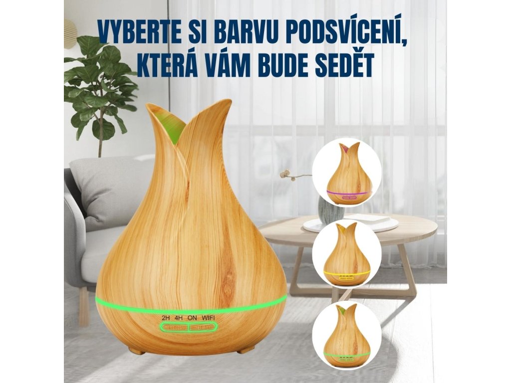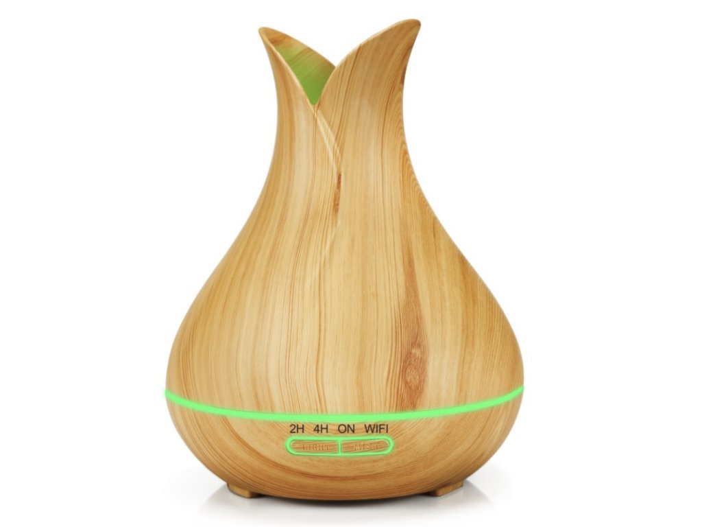 Dyfuzor zapachowy, pojemność pojemnika 400 ml, 7 kolorów podświetlenia, czas działania 12 godzin, pilot i przyciski na dyfuzorze, podświetlenie i timer włączania/wyłączania, kolor: jasnobrązowe drewno.