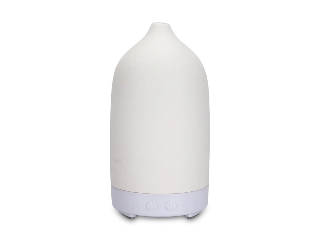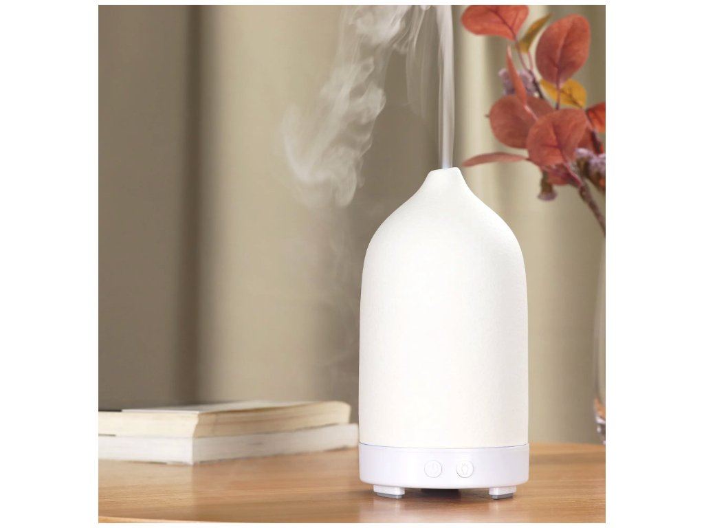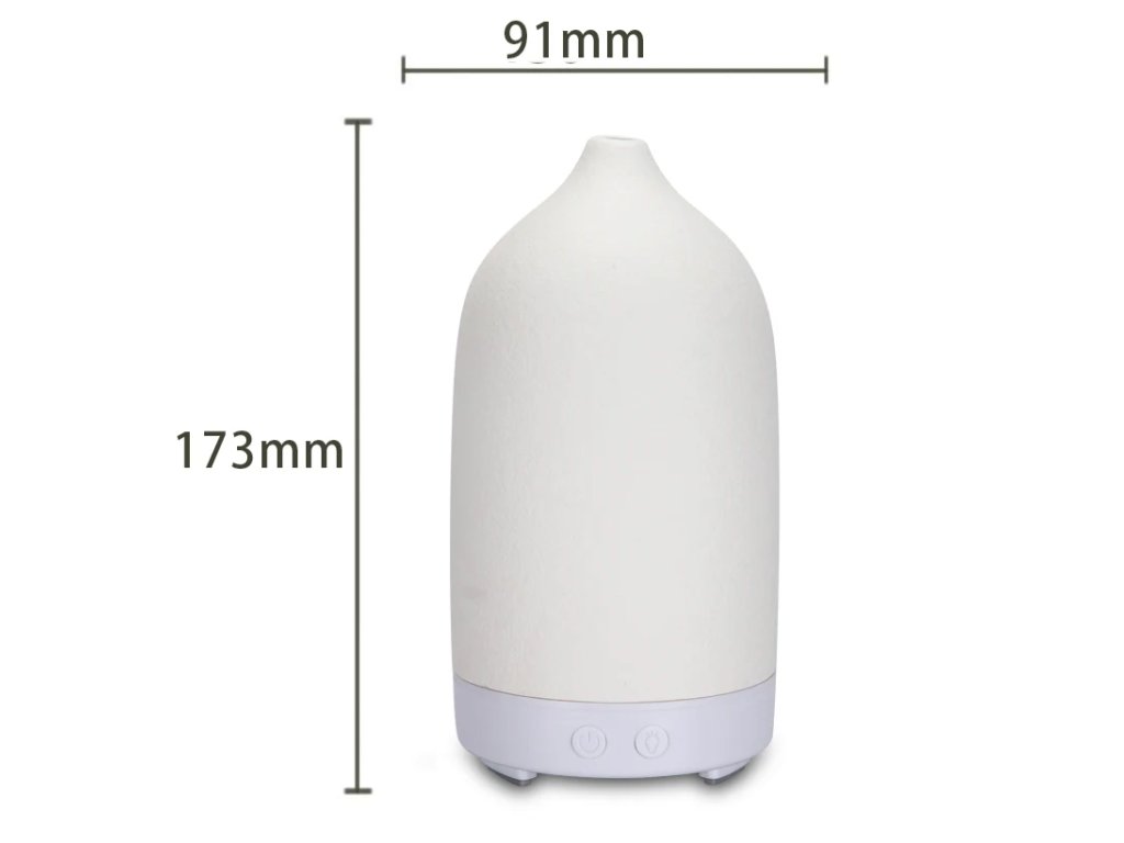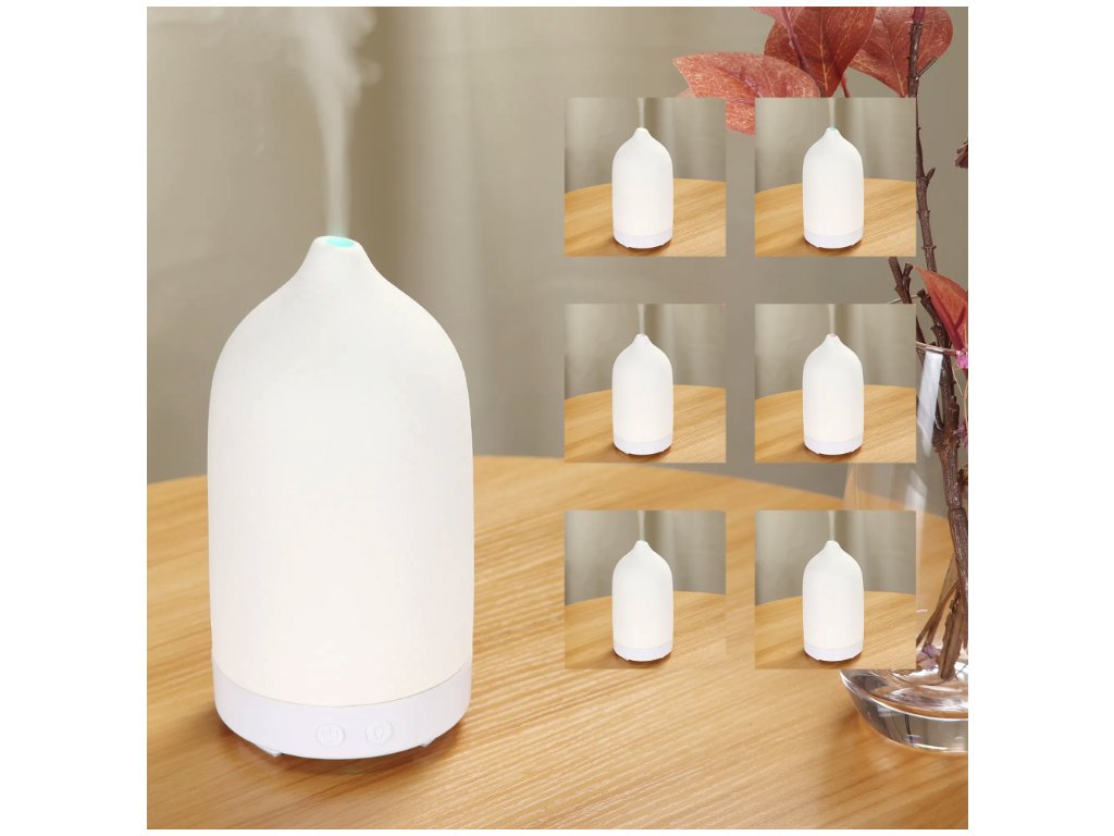 Dyfuzor zapachowy sterowany przyciskami, pojemność pojemnika 100 ml, 7 kolorowych podświetleń LED, czas działania 12 godzin, materiał: ceramika, kolor biały, niebieski, szary, zielony i czerwony.