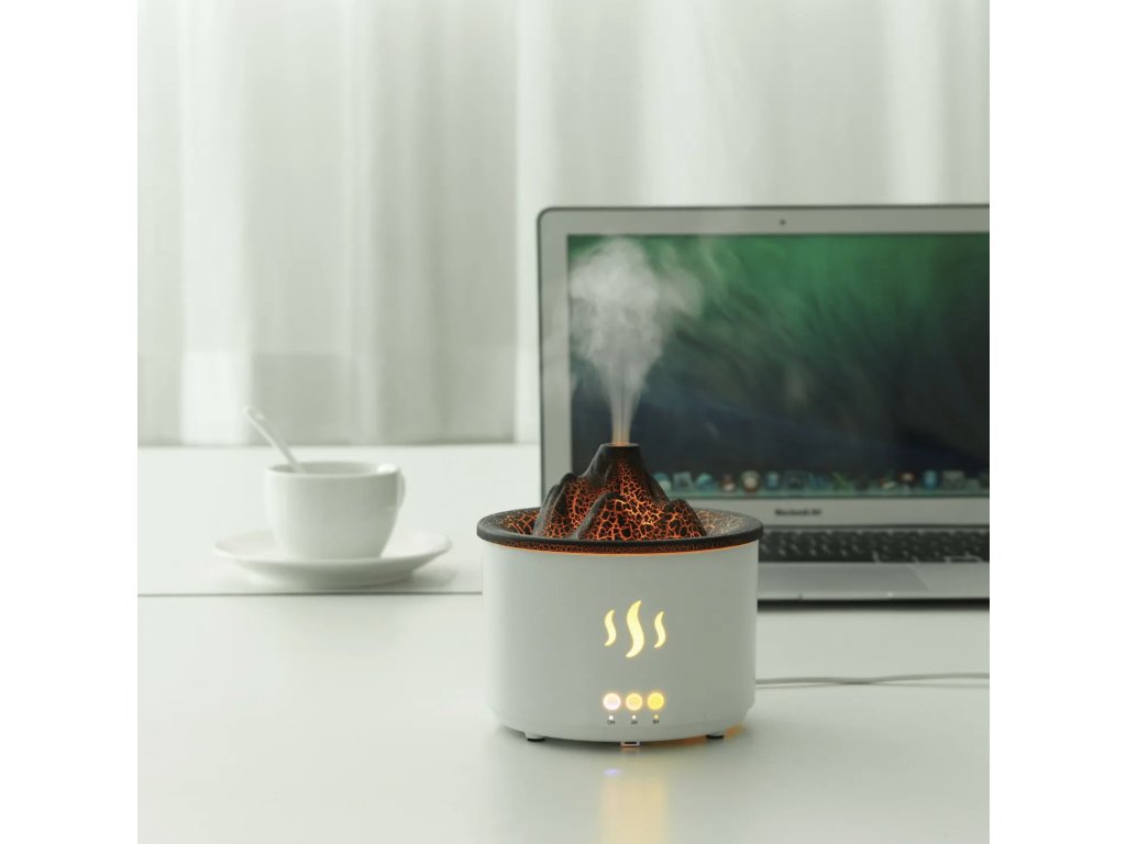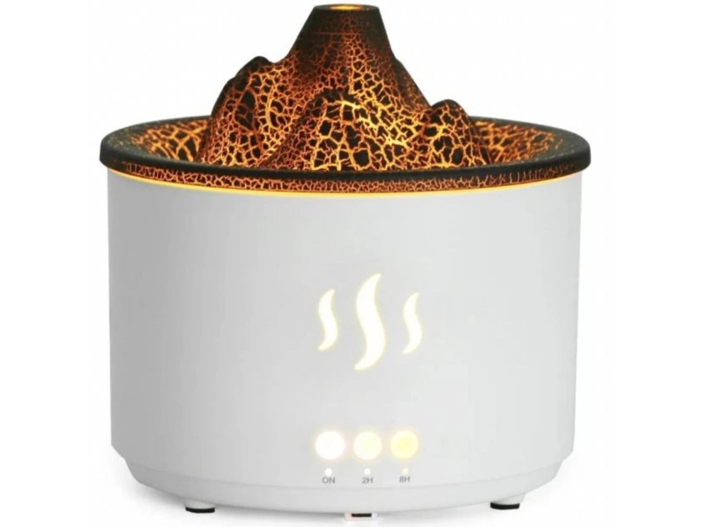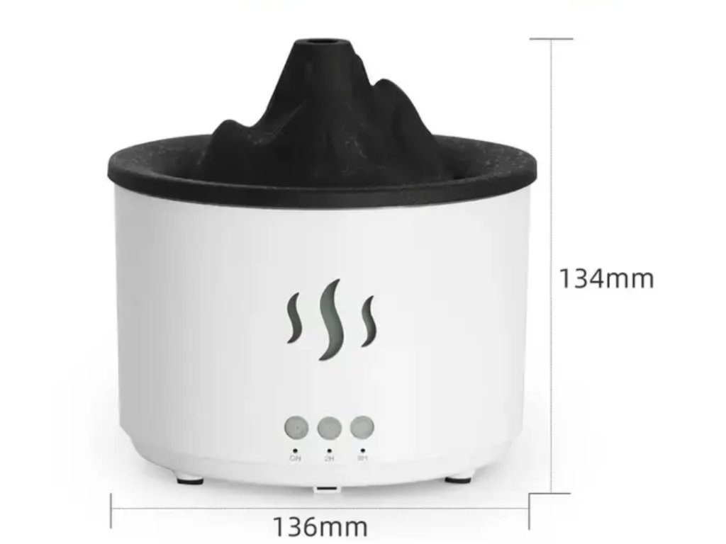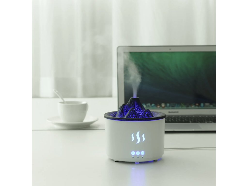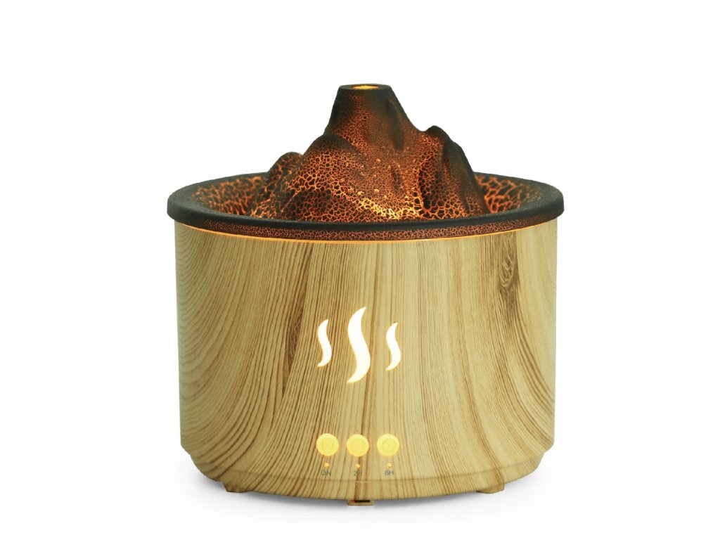 Dyfuzor zapachowy sterowany przyciskami, pojemność pojemnika 260 ml, kolorowe podświetlenie, imitacja wulkanu, czas działania 12 godzin, kolor biały i jasnobrązowe drewno.