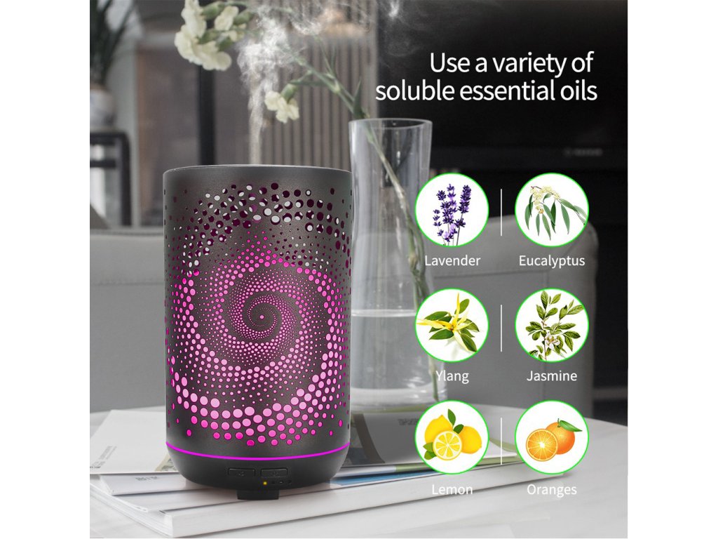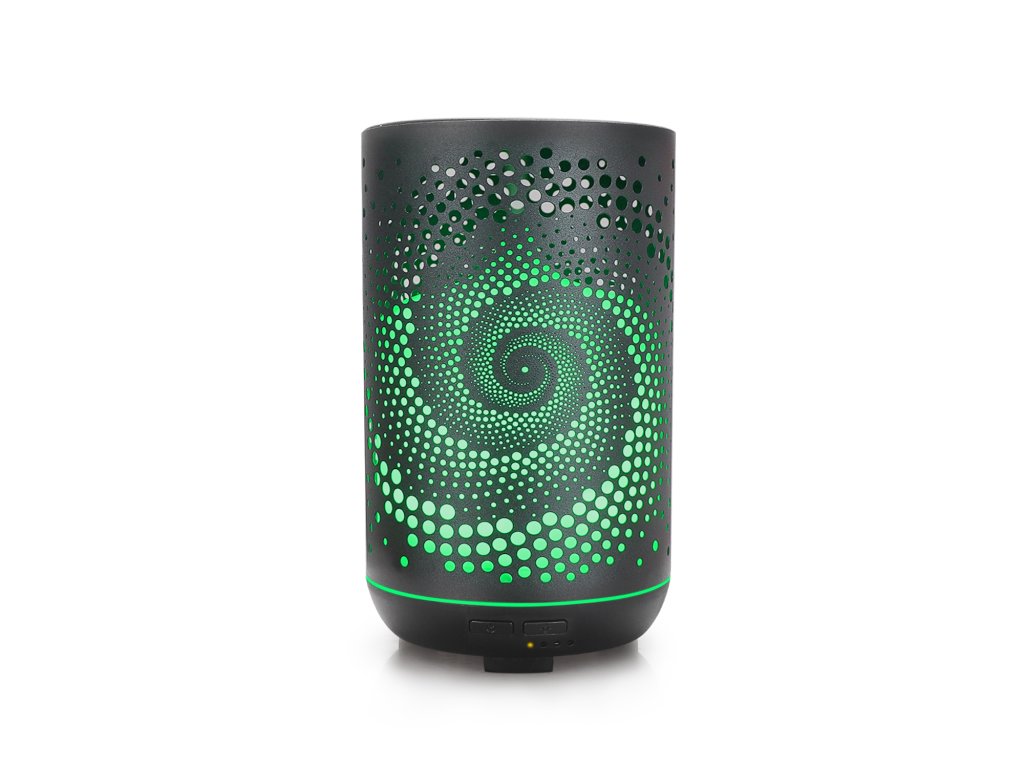 dyfuzor zapachowy sterowany przyciskami, pojemność pojemnika 300 ml, 7 kolorów podświetlenia, czas działania 12 godzin, podświetlenie, materiał metal, motyw hipnozy, kolor czarny