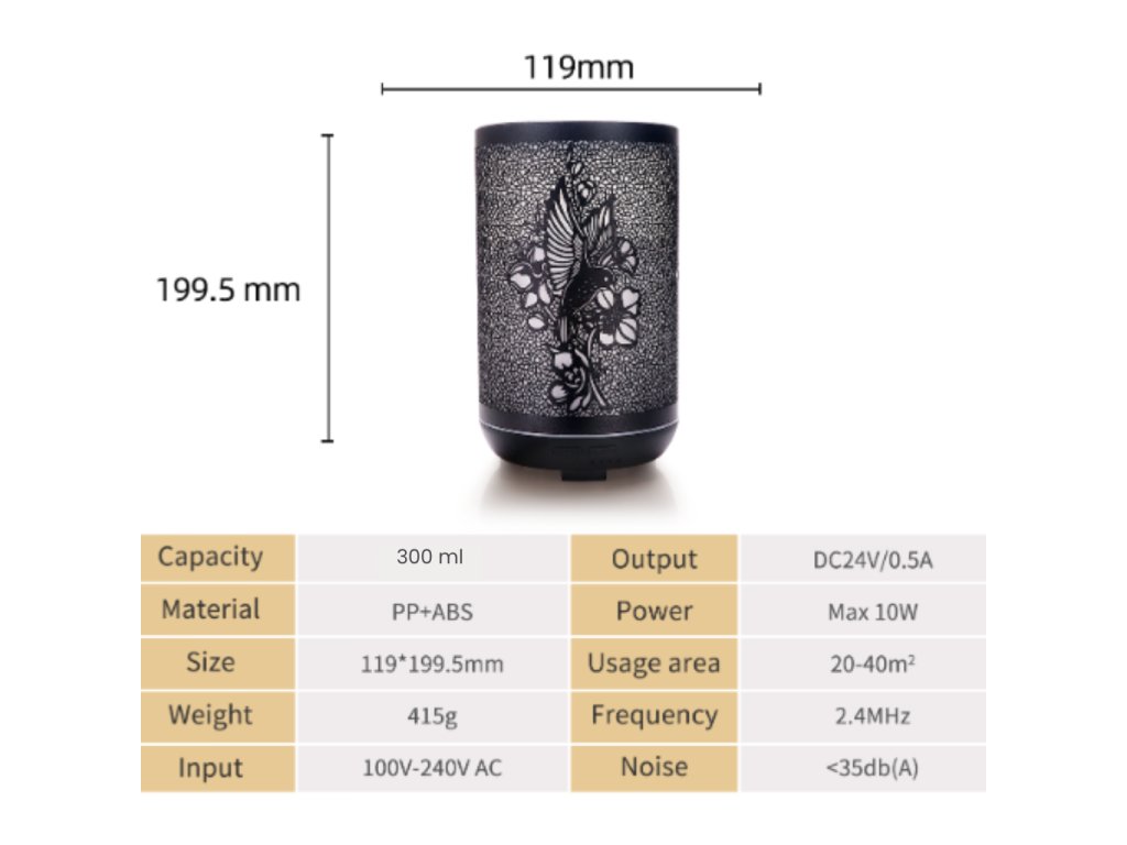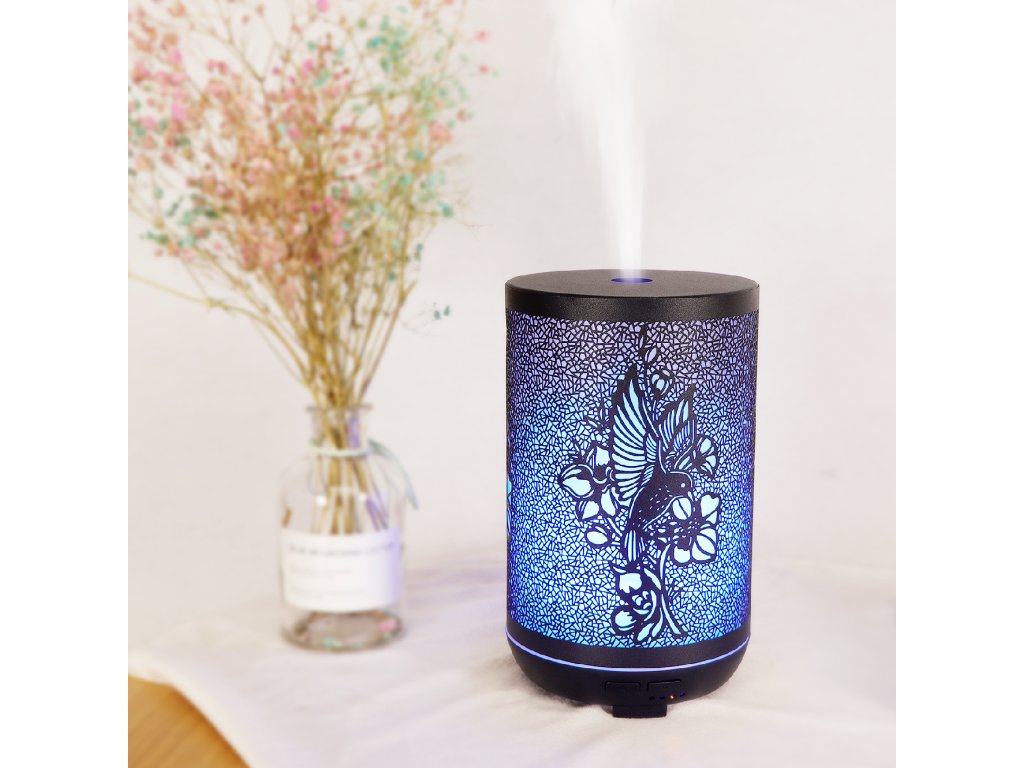 dyfuzor zapachowy sterowany przyciskami, pojemność pojemnika 300 ml, 7 kolorów podświetlenia, czas działania 12 godzin, podświetlenie, materiał metal, motyw kolibra, kolor czarny