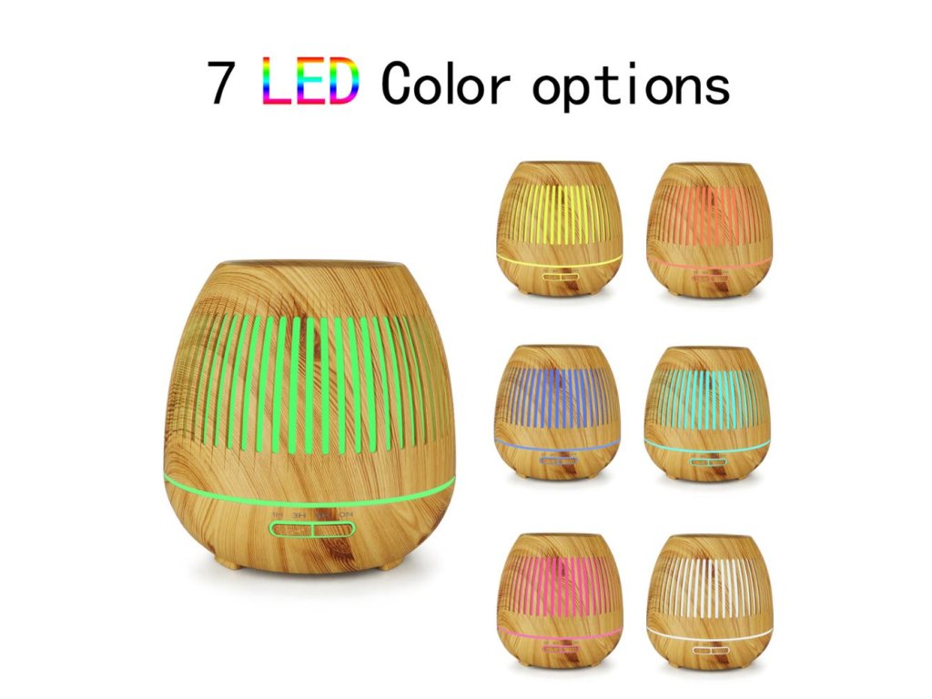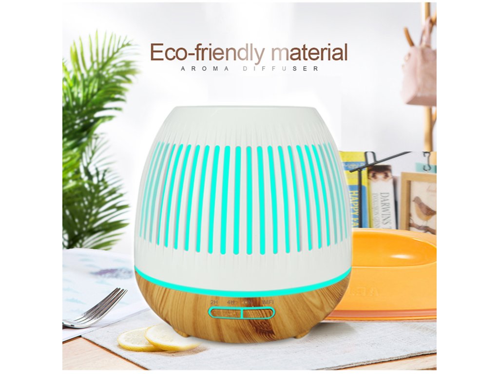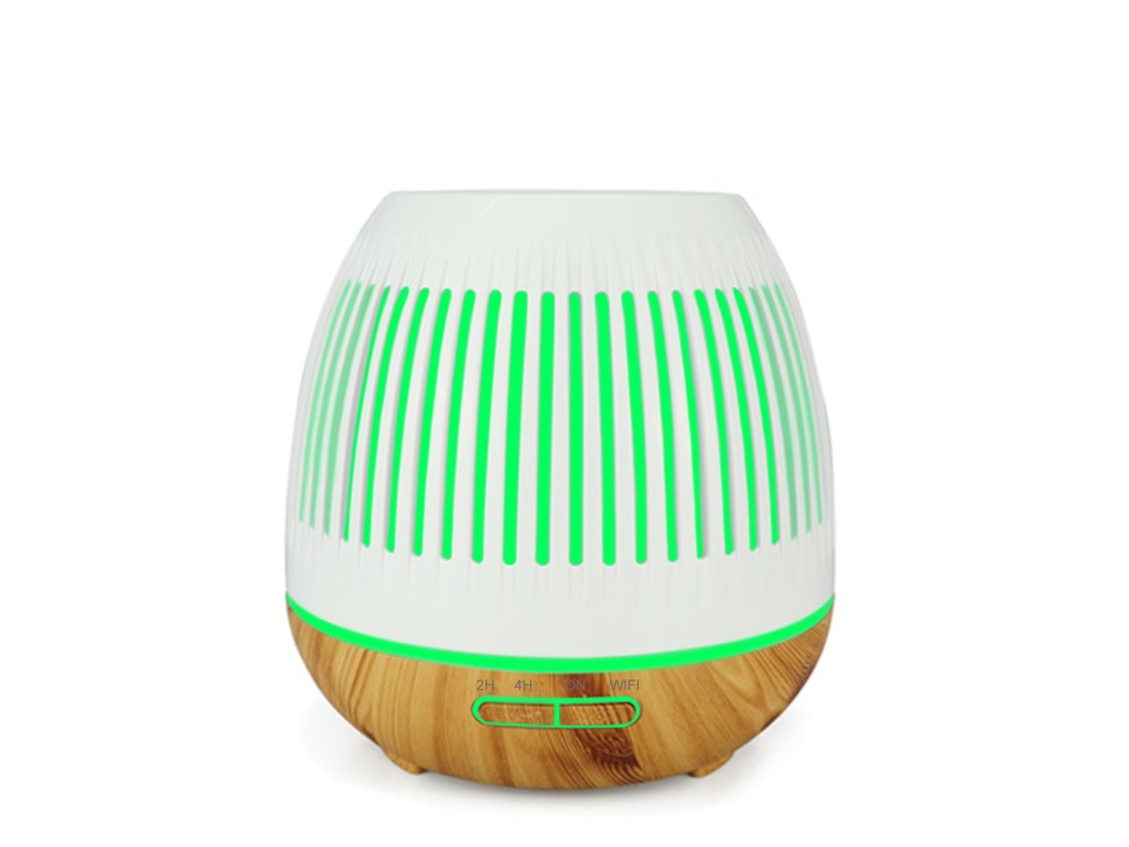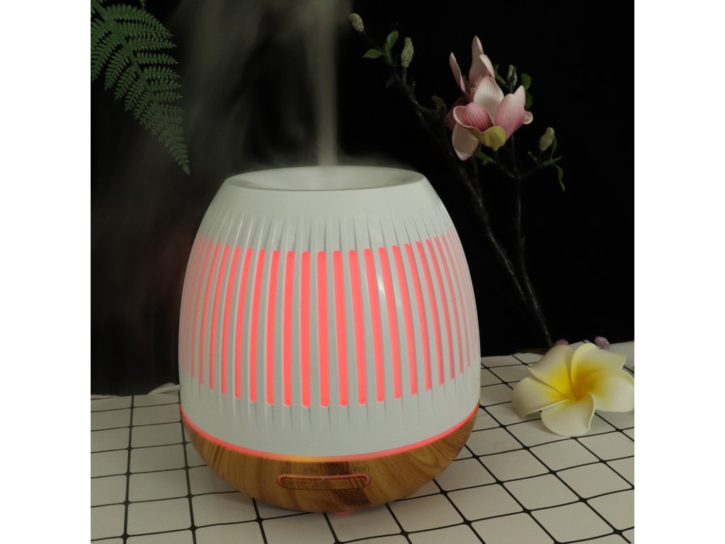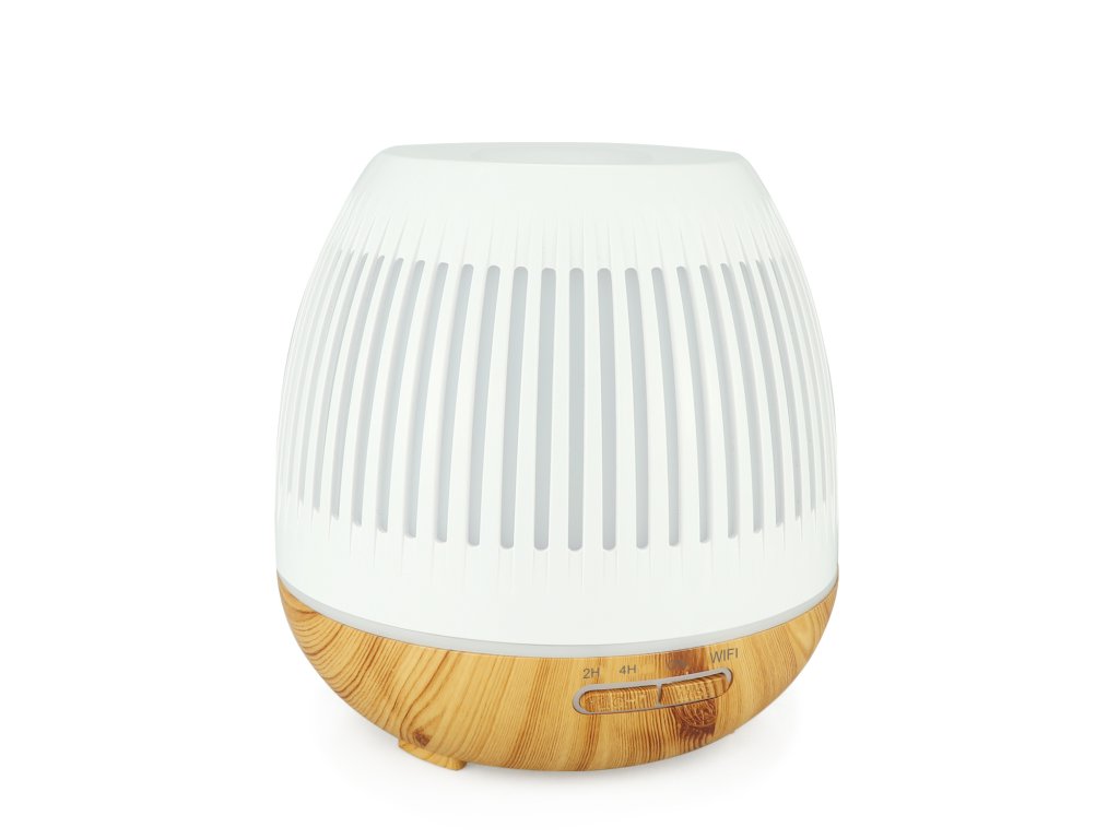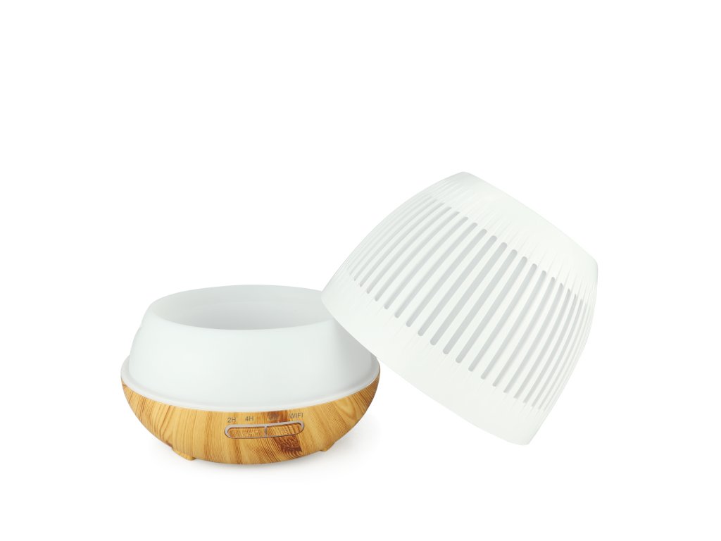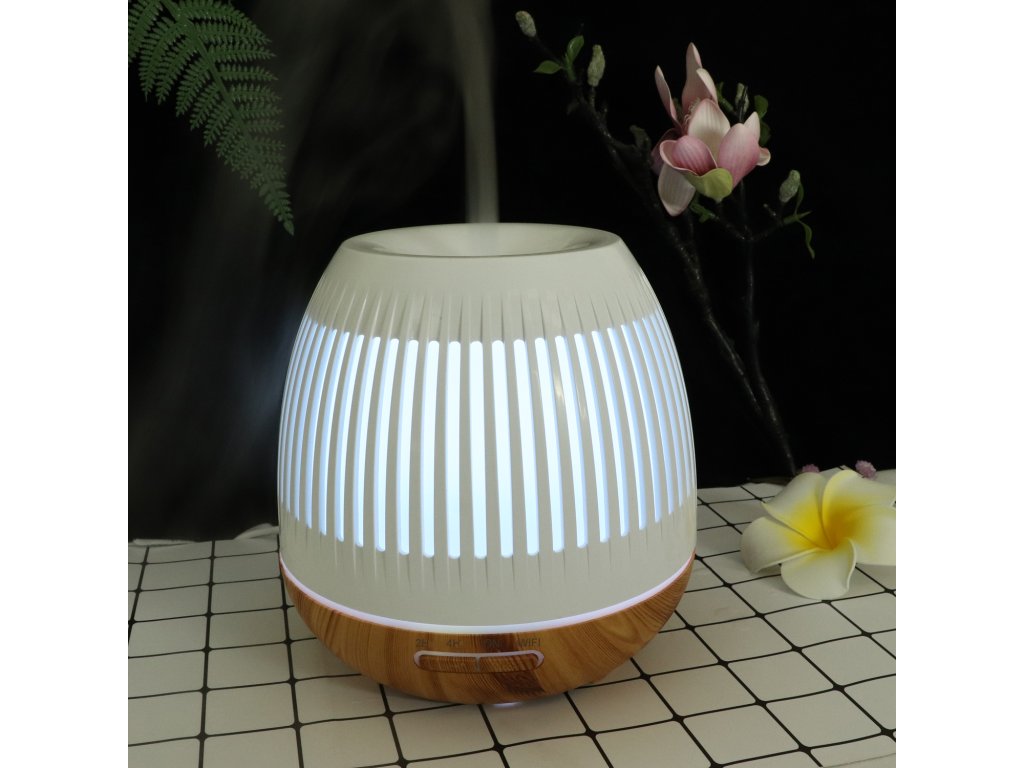Inteligentny dyfuzor zapachowy, pojemność pojemnika 400 ml, 7 kolorów podświetlenia, czas działania do 8 godzin, WIFI, podświetlenie oraz czas włączania i wyłączania, kolor biały i jasnobrązowe drewno
