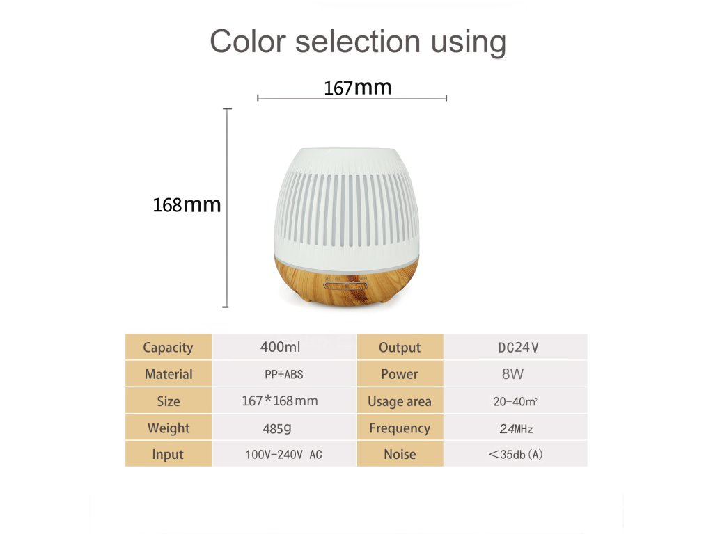 Dyfuzor wykorzystuje technologię dyfuzji ultradźwiękowej do rozpylania olejków eterycznych w pomieszczeniu. Inteligentny dyfuzor działa poprzez wytwarzanie ultradźwięków o częstotliwości 360°, które natychmiast rozpylają cząsteczki wody i olejku w powietrzu. W rezultacie stanowi znacznie zdrowszą alternatywę dla starszych dyfuzorów ciepła, które mogą uszkadzać olejki eteryczne podczas procesu rozprowadzania ciepła. Jest praktyczny i wyłącza się automatycznie, gdy zbiornik jest pusty.