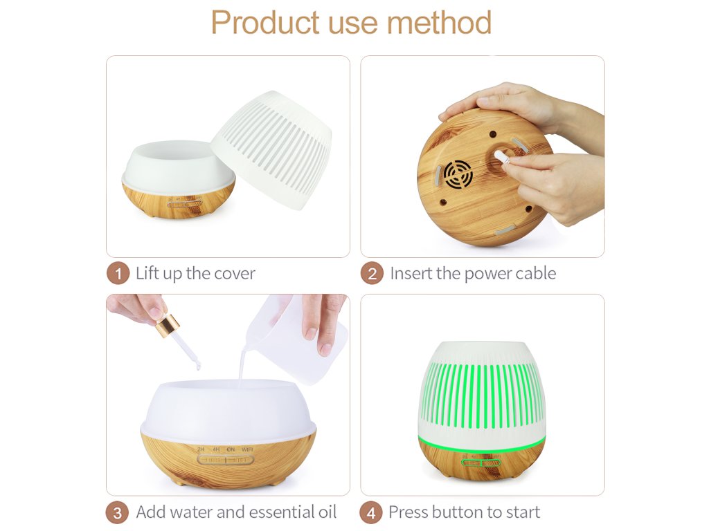 Zdejmij górną część dyfuzora, dodaj odpowiednią ilość wody i kilka kropli esencji zapachowej według własnych preferencji, naciśnij przycisk ON, połącz dyfuzor z Wi-Fi i steruj za pomocą aplikacji TuyaSmart. Możesz połączyć dyfuzor z Amazon Alexa / Google Home i za pomocą głosu wygodnie sterować inteligentnym dyfuzorem, w tym kolorami, timerem, ustawieniami mgiełki i innymi funkcjami.