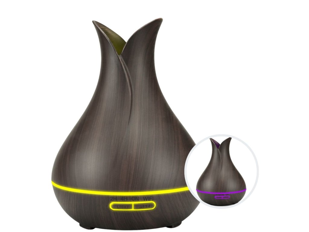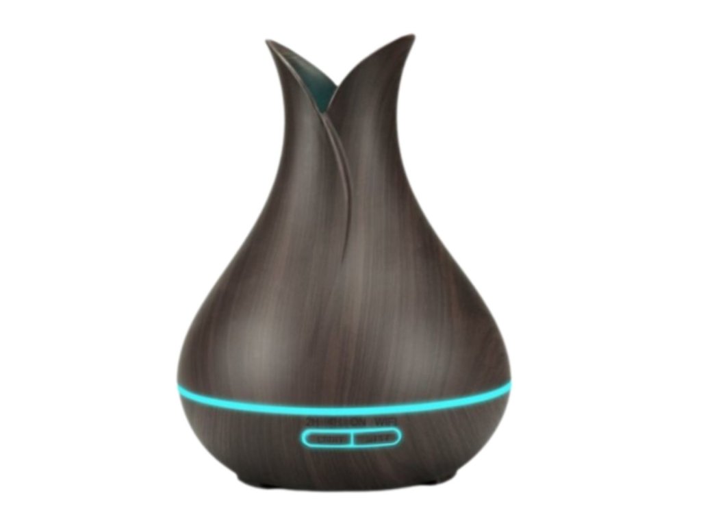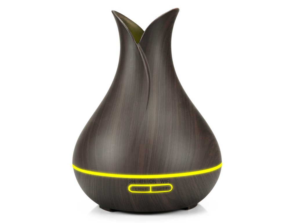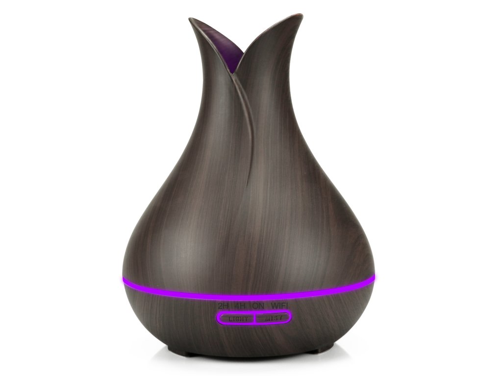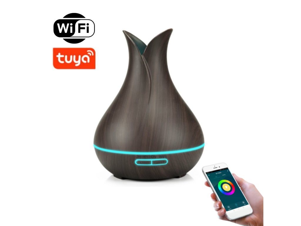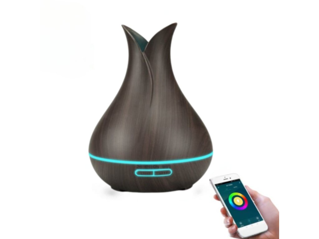 Inteligentny dyfuzor zapachowy, pojemność pojemnika 400 ml, 7 kolorów podświetlenia, czas działania 12 godzin, WiFi, podświetlenie oraz czas włączania i wyłączania, kolor ciemnobrązowego drewna