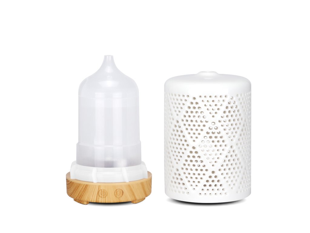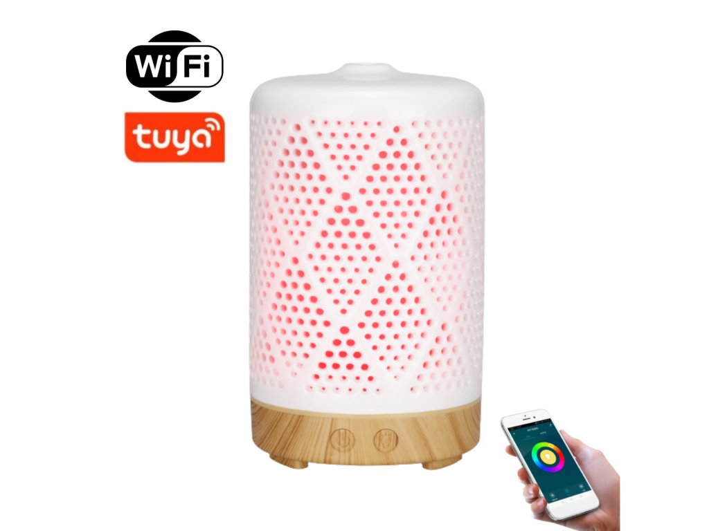 Inteligentny dyfuzor zapachowy, pojemność pojemnika 100 ml, 7 kolorów podświetlenia, czas działania 12 godzin, WiFi, podświetlenie i włączanie/wyłączanie, materiał: ceramika, kolor: biały i jasnobrązowe drewno
