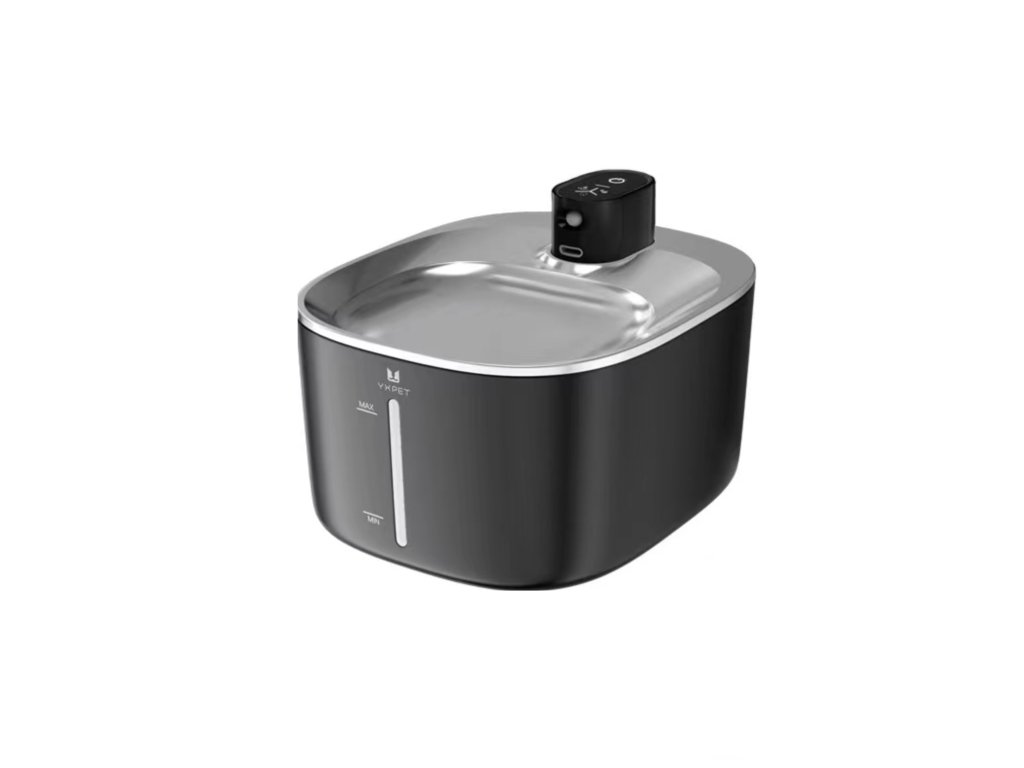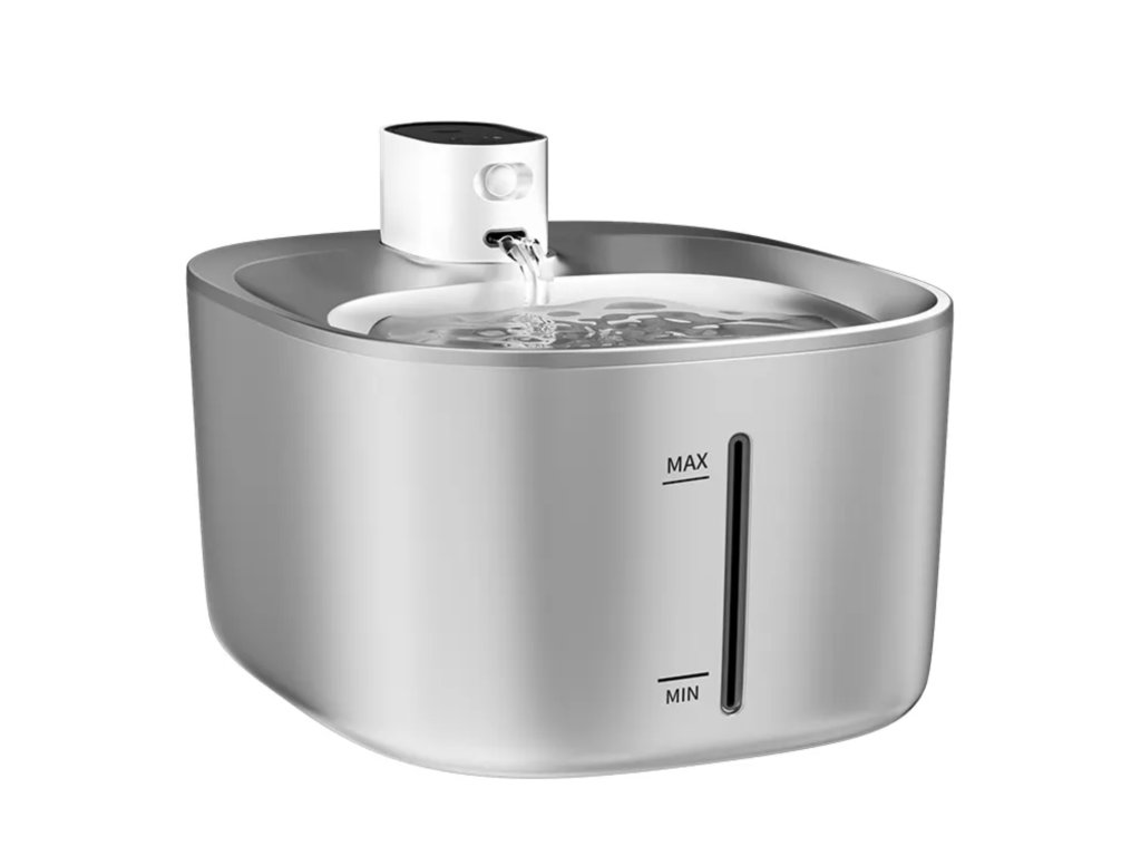 4-litrowa fontanna dla zwierząt, niski poziom hałasu, podwójne zasilanie, funkcja inteligentnego przypomnienia o trybie picia, łatwe czyszczenie, długa żywotność, obsługa bezprzewodowa, wykończenie w kolorze białym, czarnym i ze stali nierdzewnej.