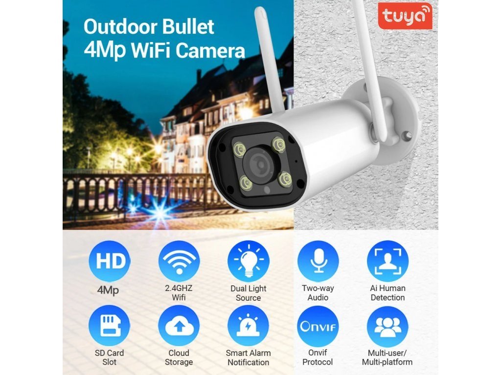 Inteligentna kamera IP/WiFi do użytku zewnętrznego, detekcja ruchu, 4 MP/6 MP, rozdzielczość 2560 x 1440 px/1800 x 3200 px, połączenie WiFi 2,4 GHz i 5 GHz, komunikacja dwukierunkowa, aplikacja mobilna Tuya Smart/Smart Life, biały design.