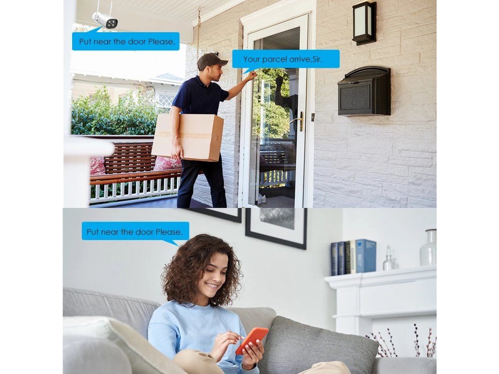 - Dwustronna komunikacja audio: Wbudowany głośnik i mikrofon umożliwiają wysokiej jakości dwustronną komunikację, idealną do odstraszania nieproszonych gości lub na przykład do komunikacji z listonoszami.