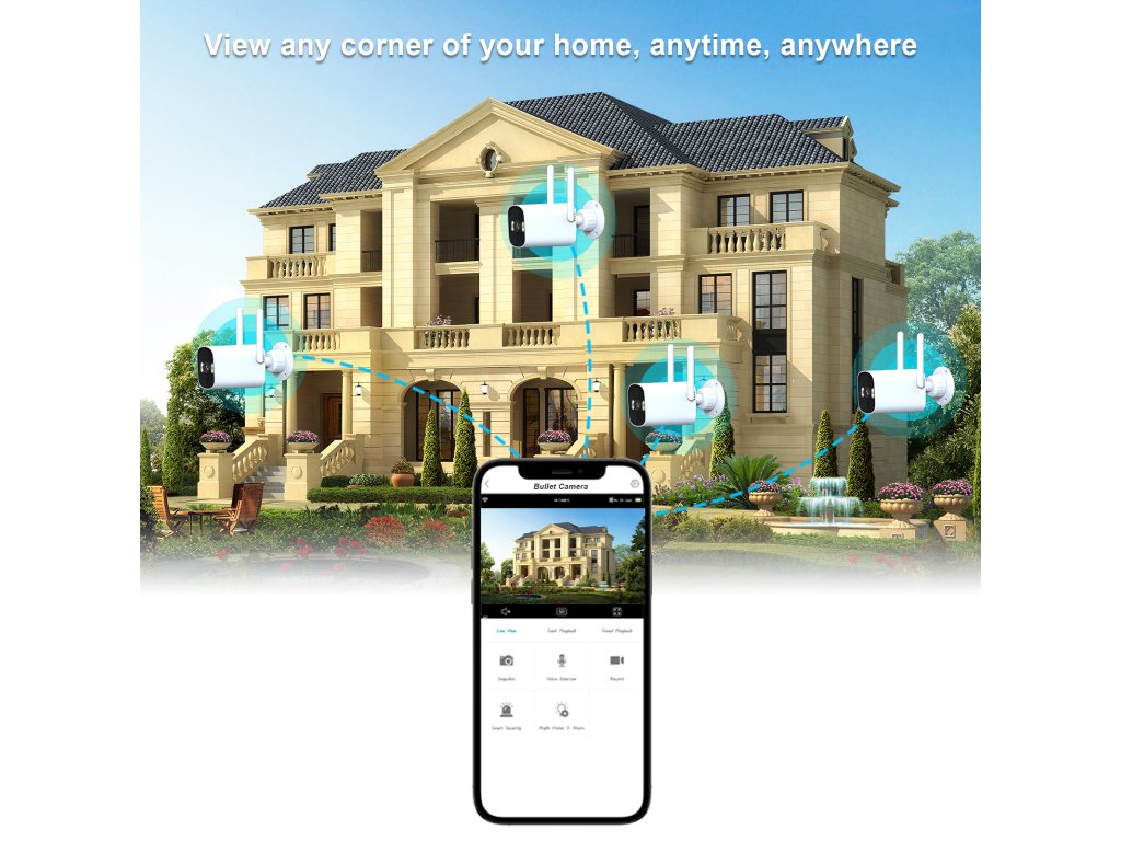 Dzięki inteligentnej zewnętrznej kamerze bezpieczeństwa zawsze będziesz mieć podgląd na to, co dzieje się wokół Twojej posesji, gdziekolwiek jesteś na świecie. Dzięki rozdzielczości 4 MP uzyskasz ostre i wyraźne zdjęcia, na których nie umknie żaden szczegół. Kamera umożliwia sterowanie obrotem w poziomie od 0° do 355° i w pionie od 0° do 90°, co daje Ci możliwość kontrolowania praktycznie dowolnego obszaru. Funkcja dwukierunkowej komunikacji pozwala rozmawiać z gośćmi lub ostrzegać intruzów bez konieczności fizycznej obecności. I co więcej? Wszystkim można łatwo sterować za pomocą aplikacji mobilnej Tuya Smart/Smart Life, która jest kompatybilna z większością inteligentnych urządzeń.