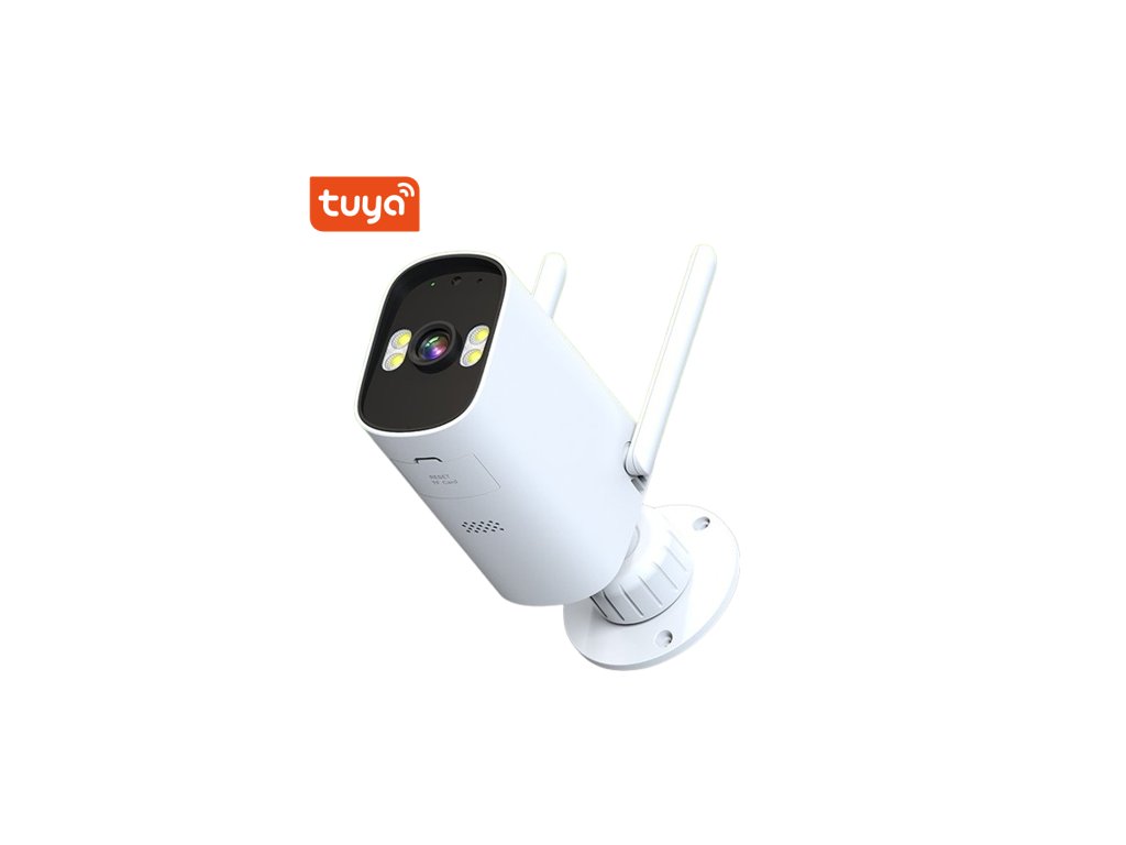 Inteligentna zewnętrzna kamera bezpieczeństwa, typu bullet, detekcja ruchu, 4 MP, rozdzielczość 2560 x 1440 px, Wi-Fi, regulacja obrotu kamery w poziomie 0°-355° i w pionie 0°-90°, komunikacja dwukierunkowa, aplikacja mobilna Tuya Smart/Smart Life, połączenie przez sieć LAN, kolor biały.