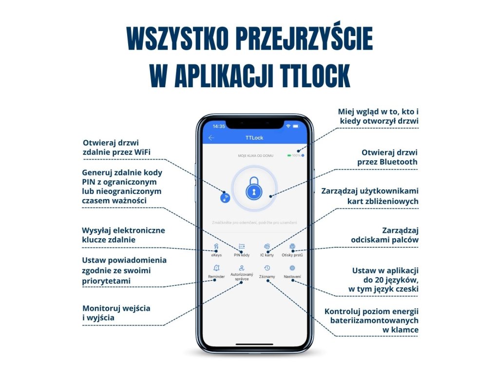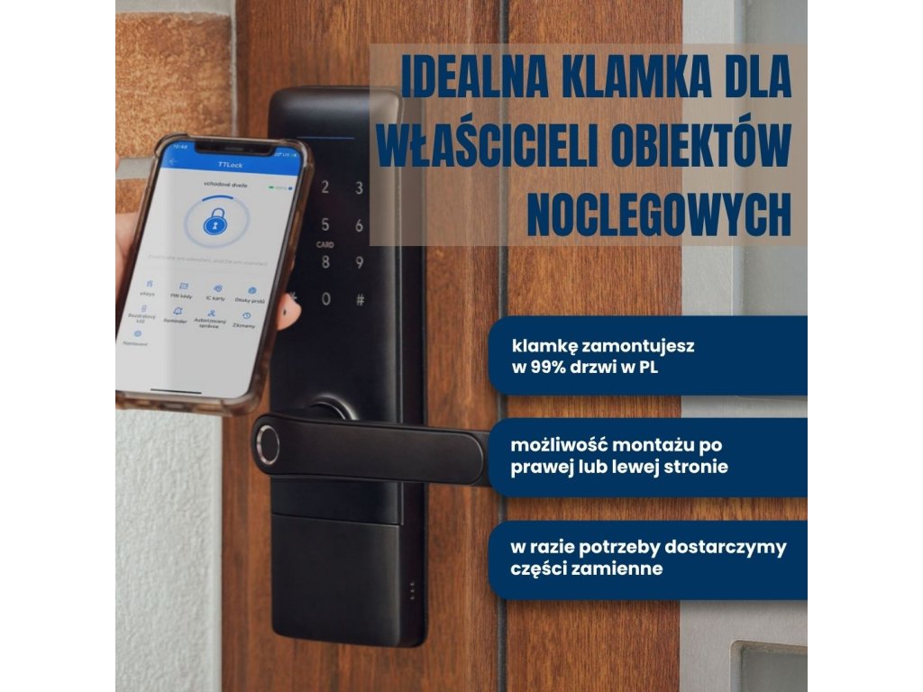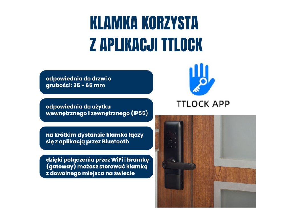 Klamka wykorzystuje do działania aplikację TTLock, która jest liderem w dziedzinie inteligentnych klamek i zamków. Aplikacja oferuje konkretne warianty dla konkretnych potrzeb operacyjnych – np. inteligentne zarządzanie hotelem, bezpieczeństwo domu, rejestrację obecności pracowników itp. (np. warianty TTHotel lub TTRenting). Jest kompatybilna z Amazon Alexa i Google Home. Oferujemy również klamki obsługujące aplikację TUYA, które oferują wystarczającą funkcjonalność dla przeciętnego użytkownika, jednak aplikacja TTLock jest bardziej odpowiednia dla bardziej wymagających użytkowników. Klamkę z obsługą aplikacji TUYA polecamy głównie klientom, którzy mają już część swojego inteligentnego domu opartą na tej aplikacji lub rozważają zakup innych produktów obsługujących jedną z aplikacji w przyszłości. Zawsze możesz sprawdzić, którą aplikację obsługuje dany uchwyt, po jego nazwie.