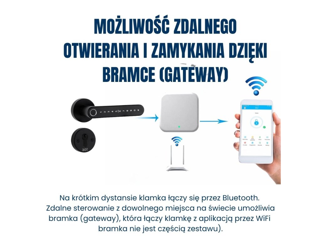 Klamka standardowo komunikuje się przez Bluetooth. Aby sterować nią zdalnie z dowolnego miejsca lub głosem (Google Asystent, Alexa), należy podłączyć ją do internetu. Służy do tego gateway, który trzeba dokupić.