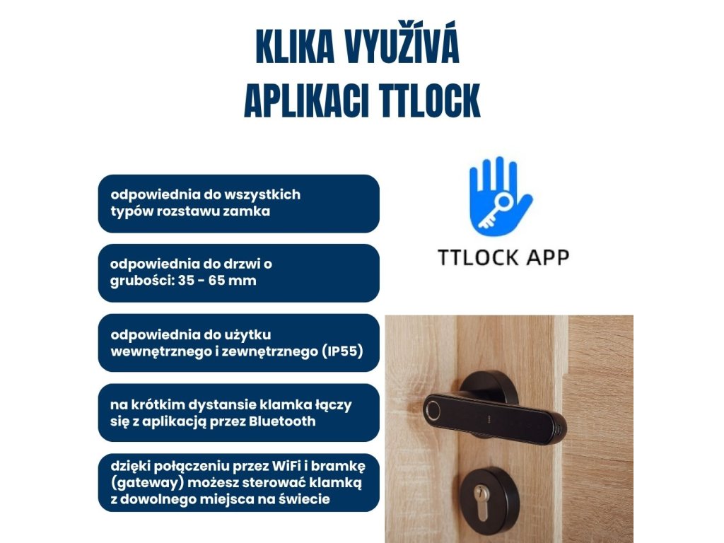 Klamka współpracuje z TTLock – liderem w dziedzinie inteligentnych klamek i zamków. Ekosystem oferuje warianty pod konkretne potrzeby (np. TTHotel, TTRenting), a także kompatybilność z Amazon Alexa i Google Home. Mamy też modele korzystające z TUYA – dla typowego użytkownika będą wystarczające, jednak wymagającym polecamy TTLock. Informację o wspieranej aplikacji znajdziesz zawsze w nazwie klamki.