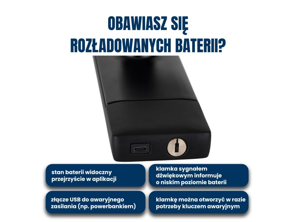 Dobre baterie wytrzymują w klamce nawet 10 miesięcy przy 20 otwarciach dziennie. W aplikacji masz zawsze podgląd stanu naładowania. Jeśli mimo to baterie rzeczywiście się rozładują, możesz otworzyć drzwi klasycznym kluczem (jeśli masz zainstalowaną wkładkę cylindryczną) lub łatwo podłączyć klamkę przez USB np. do powerbanku lub innego źródła zasilania i otworzyć drzwi.
