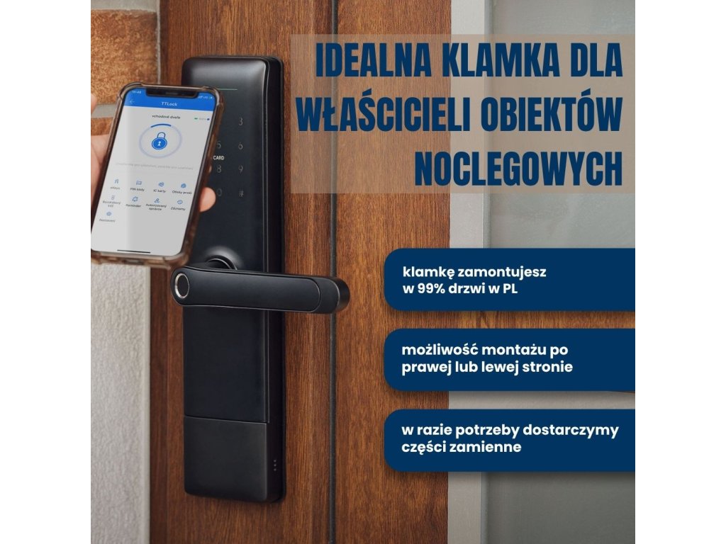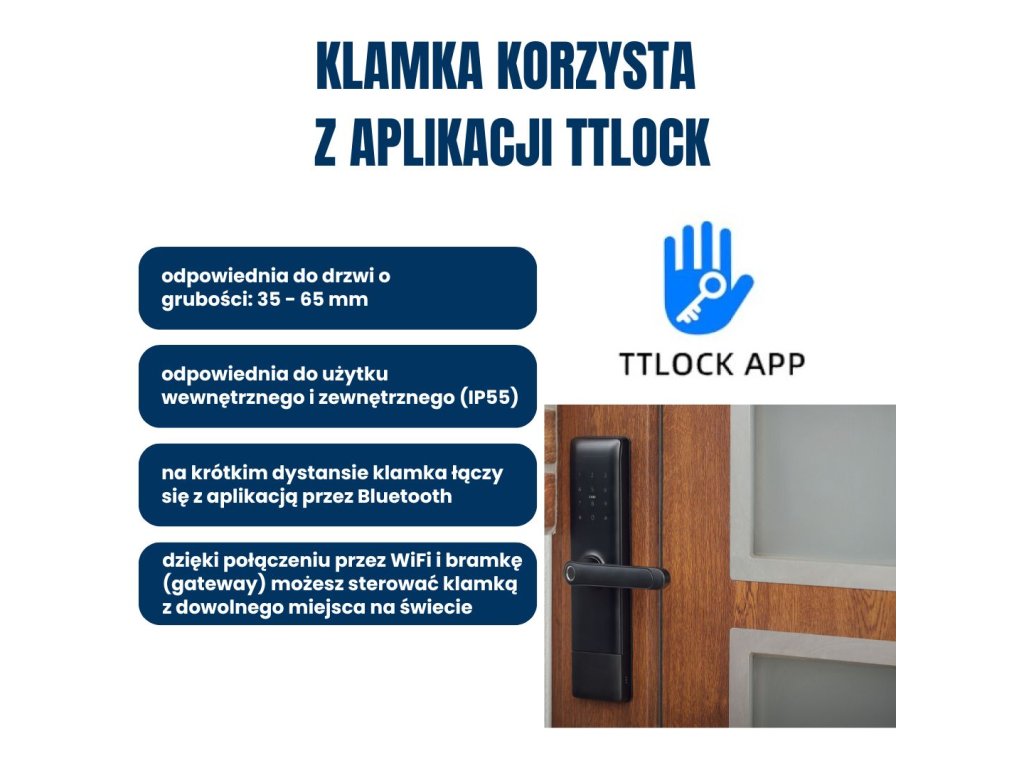 Klamka korzysta z aplikacji TTLock, która jest liderem w obszarze inteligentnych klamek i zamków. Aplikacja oferuje warianty dopasowane do specyficznych potrzeb – np. inteligentne zarządzanie hotelem, zabezpieczenie domu, ewidencja czasu pracy (np. TTHotel lub TTRenting). Jest kompatybilna z Amazon Alexa i Google Home. W ofercie mamy również klamki działające w aplikacji TUYA, które dla przeciętnego użytkownika oferują wystarczającą funkcjonalność, jednak dla bardziej wymagających lepszym wyborem jest TTLock. Klamki z TUYA polecamy zwłaszcza klientom, którzy już mają część inteligentnego domu opartą o tę aplikację lub planują kolejne produkty obsługiwane w jednym systemie. Z jaką aplikacją działa dana klamka, zawsze poznasz z jej nazwy.