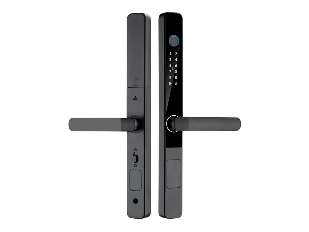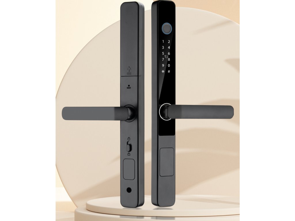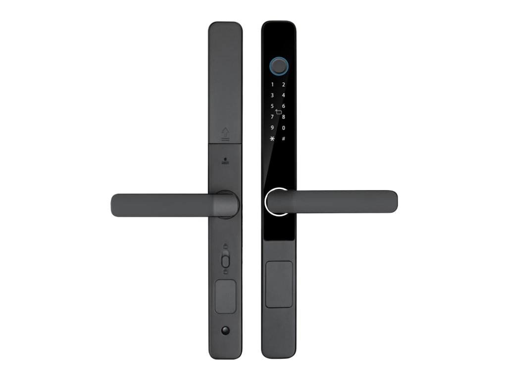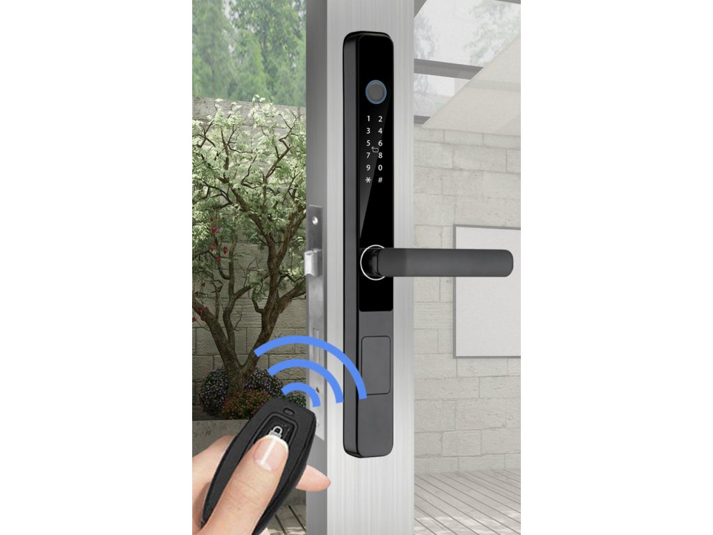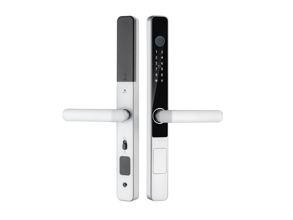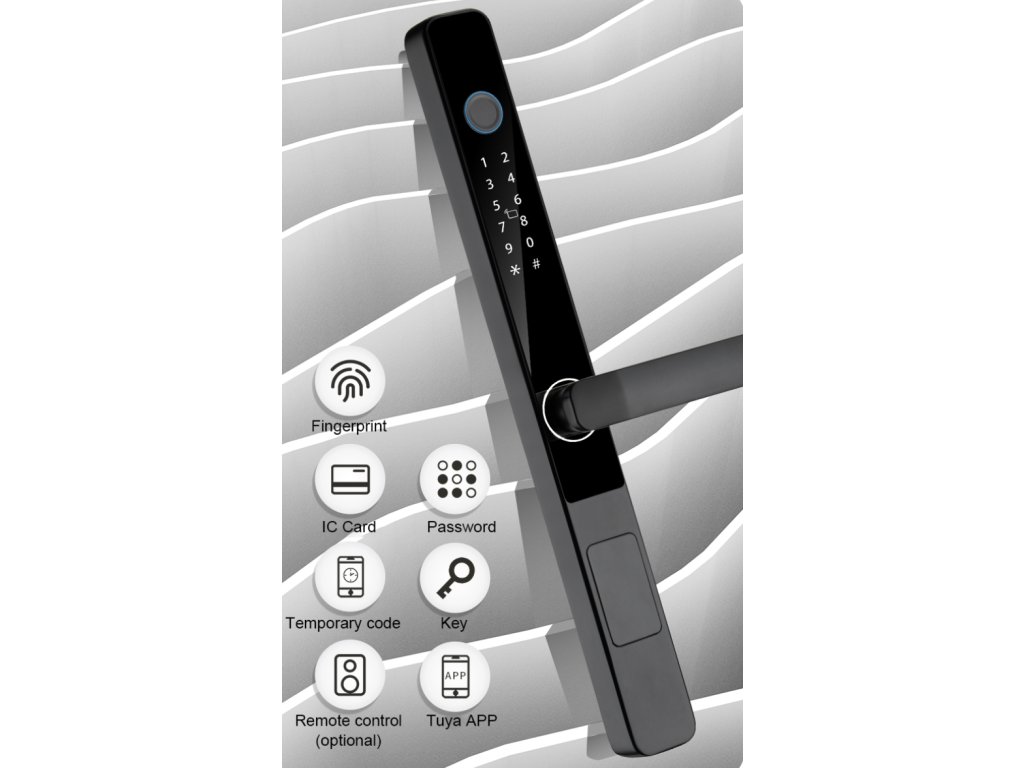 Inteligentny uchwyt, Bluetooth, sterowanie za pomocą aplikacji mobilnej TTLock, 5 opcji odblokowania (klucz, odcisk palca, kod numeryczny, karta inteligentna, telefon komórkowy), ukryty otwór na wkładkę bębenkową, funkcja automatycznej blokady, orientacja w prawo i w lewo, zasilanie 4 bateriami AA, czarny lub srebrny design.