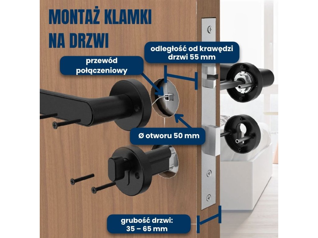 - ✔ Zalecana grubość drzwi: 35–55 mm