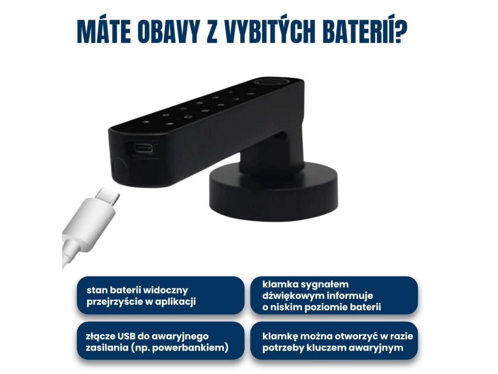 Wysokiej jakości baterie wytrzymują w klamce do 10 miesięcy przy 20 odblokowaniach dziennie. W aplikacji masz zawsze podgląd poziomu naładowania. Jeśli mimo to baterie całkowicie się wyczerpią, możesz otworzyć drzwi klasycznym kluczem (jeśli masz zamontowaną wkładkę cylindryczną) lub podłączyć klamkę przez USB, np. do powerbanku, i w ten sposób otworzyć drzwi.