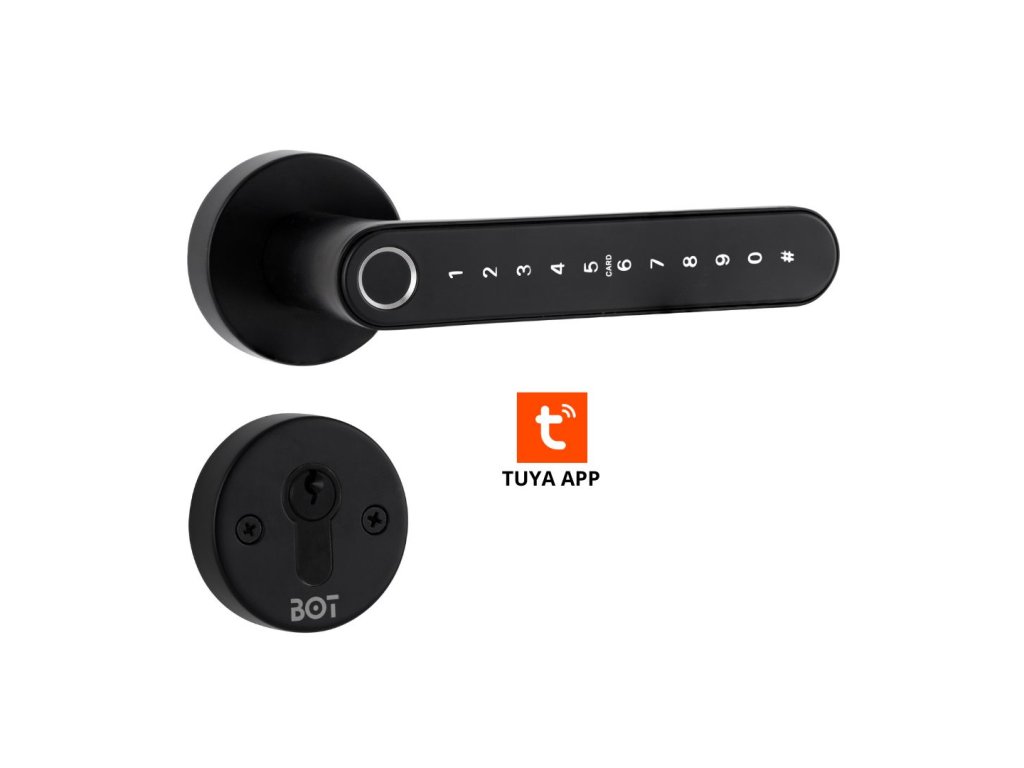 Inteligentny uchwyt Bluetooth / WiFi, odpowiedni do użytku wewnętrznego, sterowanie za pomocą Tuya, 5 opcji odblokowania (klucz, odcisk palca, kod numeryczny, karta inteligentna, telefon komórkowy), zalecana grubość drzwi 35-55 mm, możliwość montażu w prawej i lewej orientacji, zasilany 4 bateriami AAA, czarny