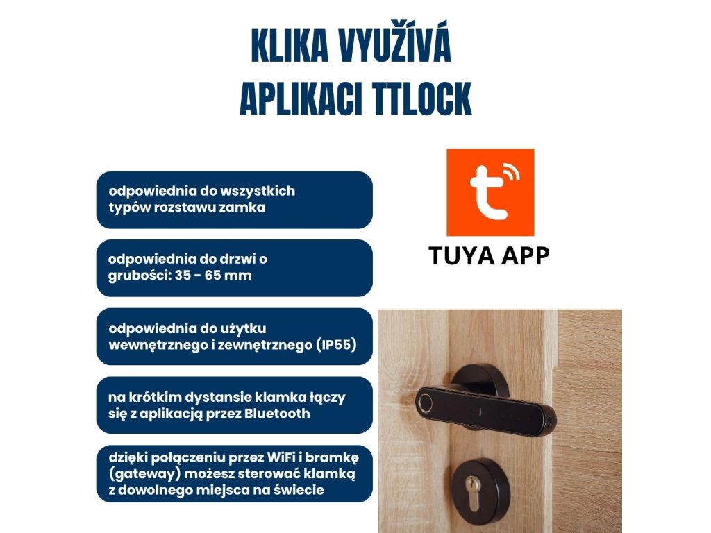 Klamka korzysta z aplikacji TTLock, która jest liderem w dziedzinie inteligentnych klamek i zamków. Aplikacja oferuje konkretne warianty dla specyficznych potrzeb – np. inteligentne zarządzanie hotelem, zabezpieczenie domu, rejestrację obecności pracowników (np. TTHotel lub TTRenting). Jest kompatybilna z Amazon Alexa i Google Home. W ofercie mamy także klamki działające w aplikacji TUYA – dla przeciętnego użytkownika mają wystarczającą funkcjonalność, jednak dla bardziej wymagających polecamy TTLock. Klamkę z obsługą TUYA rekomendujemy szczególnie klientom, którzy mają już część smart domu opartą na tej aplikacji lub planują zakup kolejnych kompatybilnych produktów. Informację o obsługiwanej aplikacji znajdziesz zawsze w nazwie klamki.
