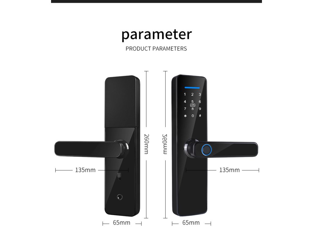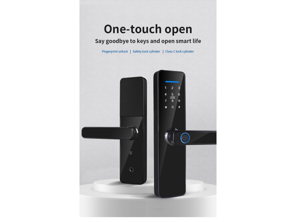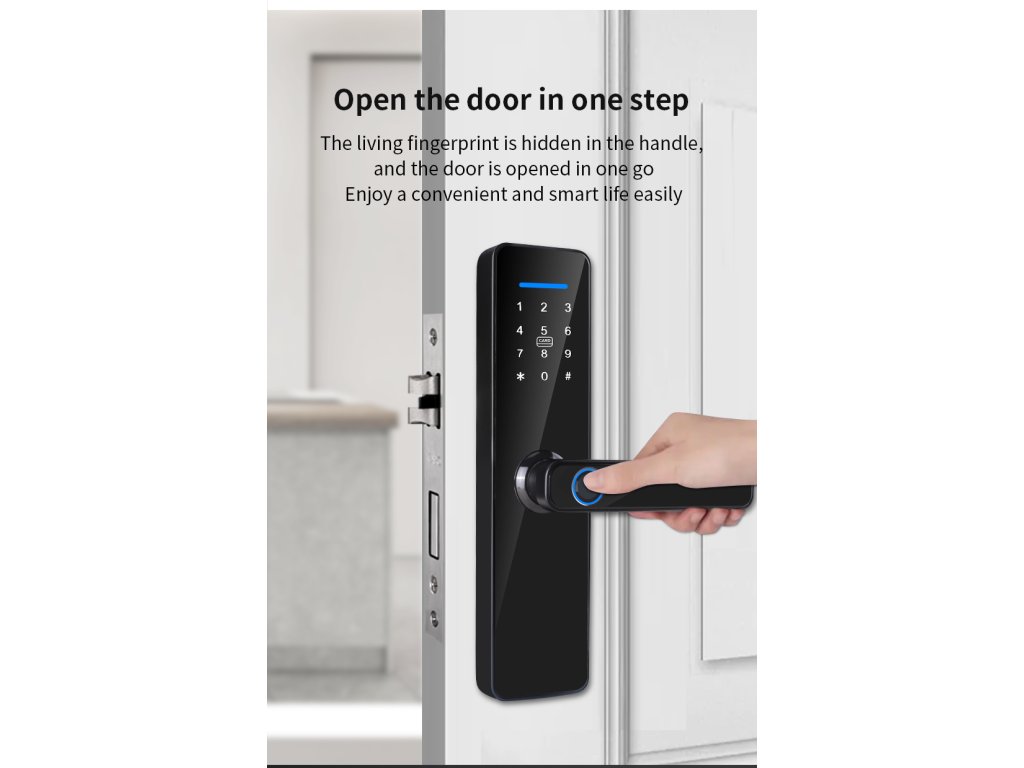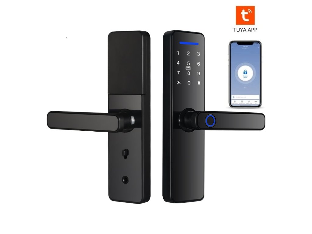 Inteligentny uchwyt Bluetooth / WiFi / Zigbee, sterowanie za pomocą aplikacji mobilnej Tuya Smart/Smart Life, 5 opcji odblokowania (klucz, odcisk palca, kod numeryczny, karta inteligentna, telefon komórkowy), funkcja automatycznej blokady, możliwość ustawienia w prawo i w lewo, zasilany 4 bateriami AA, czarny.