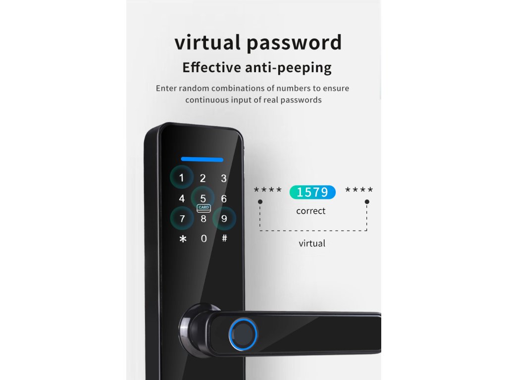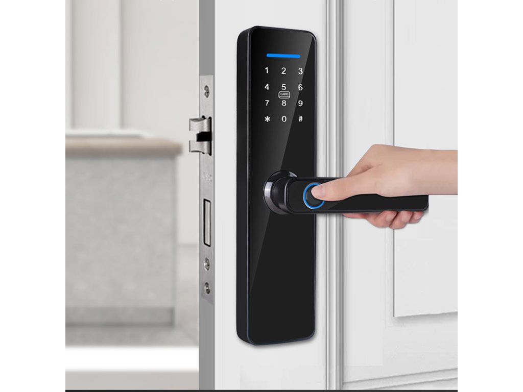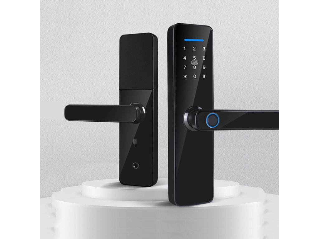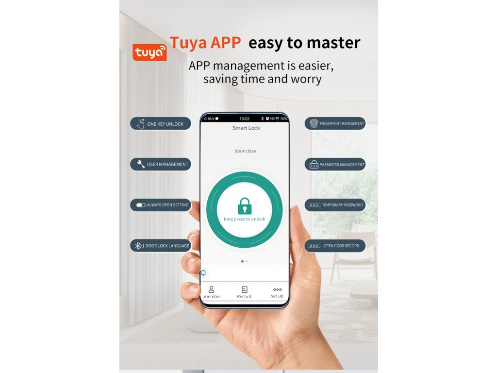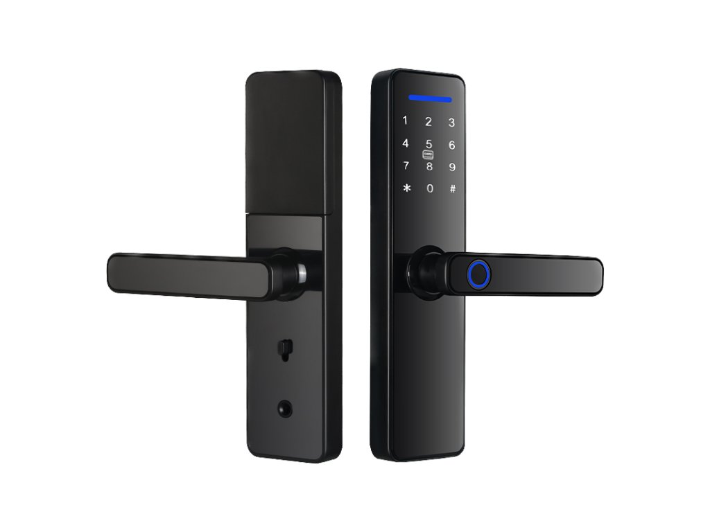 Inteligentny uchwyt Bluetooth / WiFi / Zigbee, sterowanie za pomocą aplikacji mobilnej Tuya Smart/Smart Life, 5 opcji odblokowania (klucz, odcisk palca, kod numeryczny, karta inteligentna, telefon komórkowy), funkcja automatycznej blokady, możliwość ustawienia w prawo i w lewo, zasilany 4 bateriami AA, czarny.
