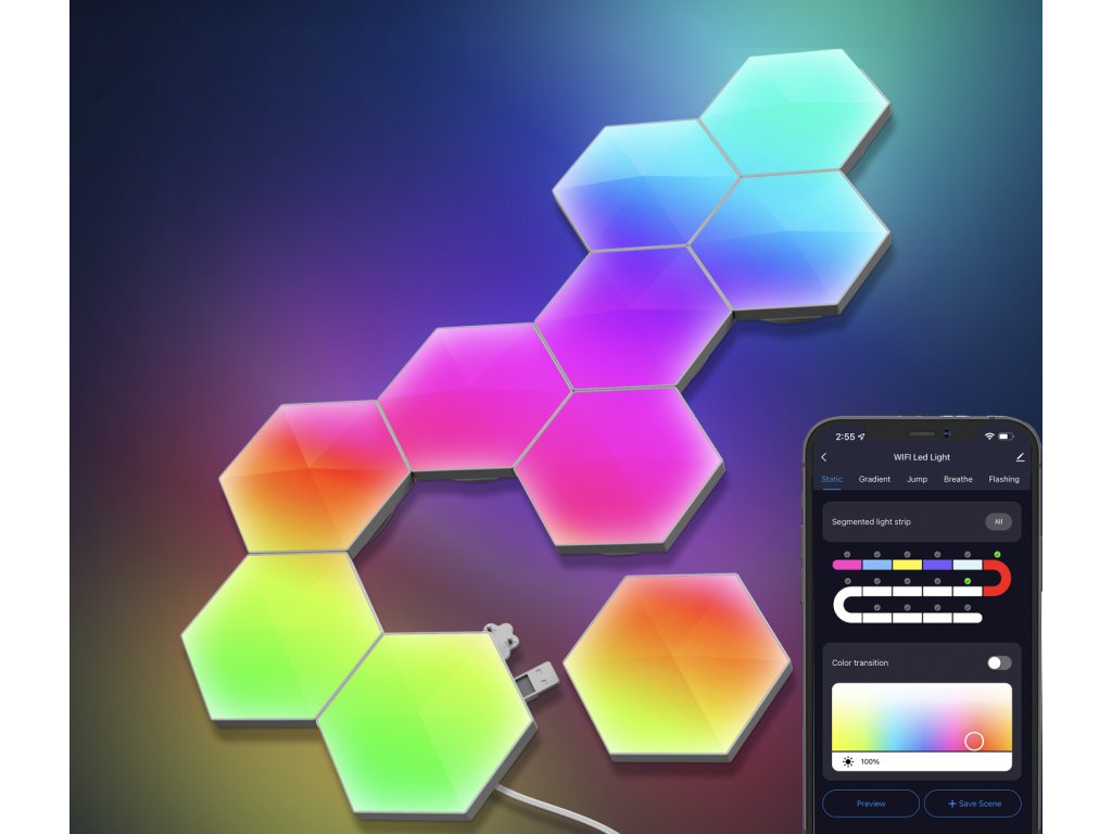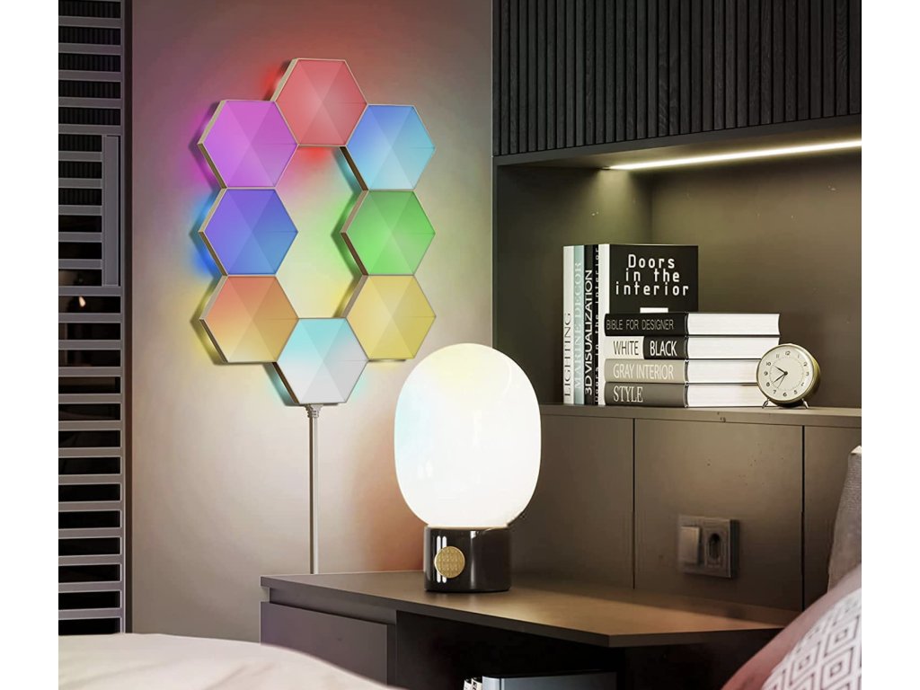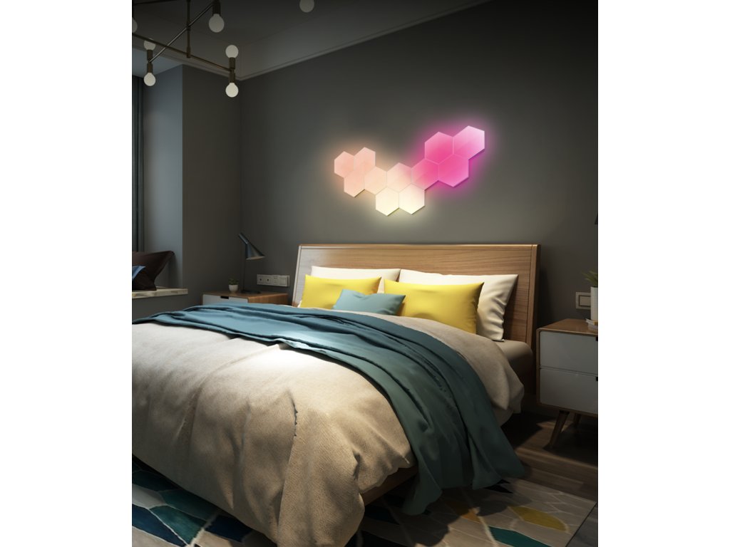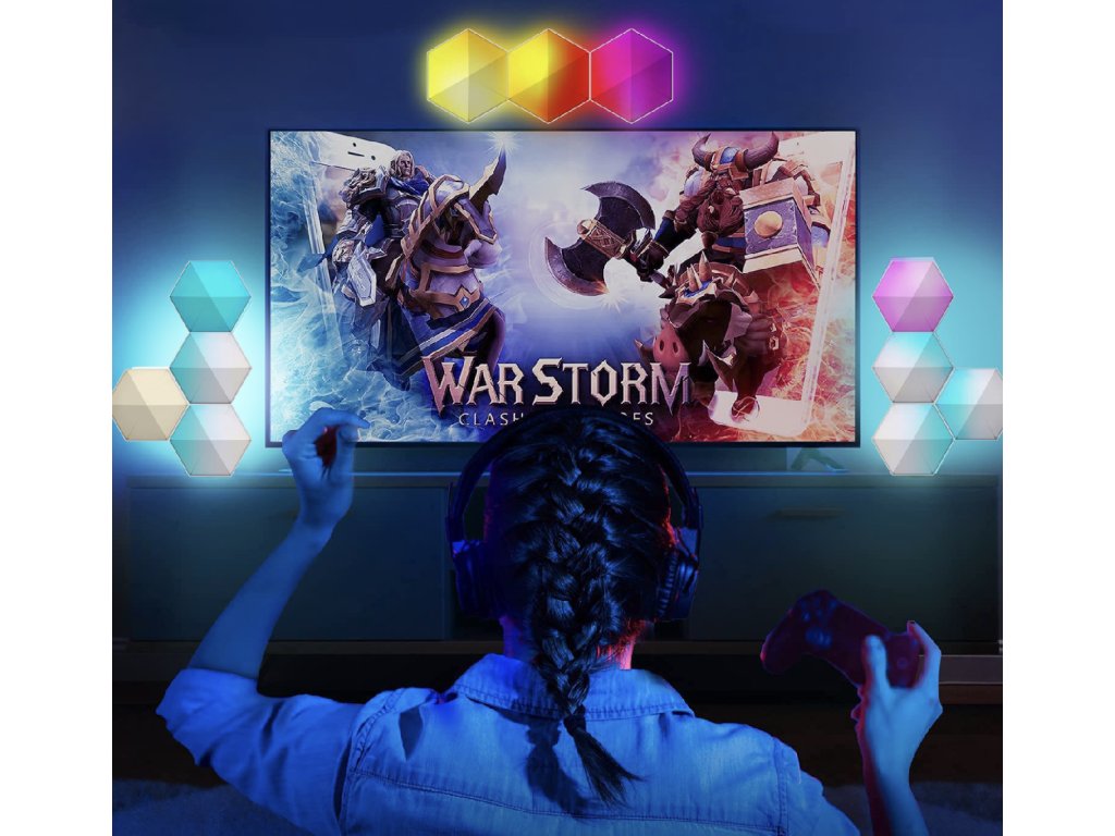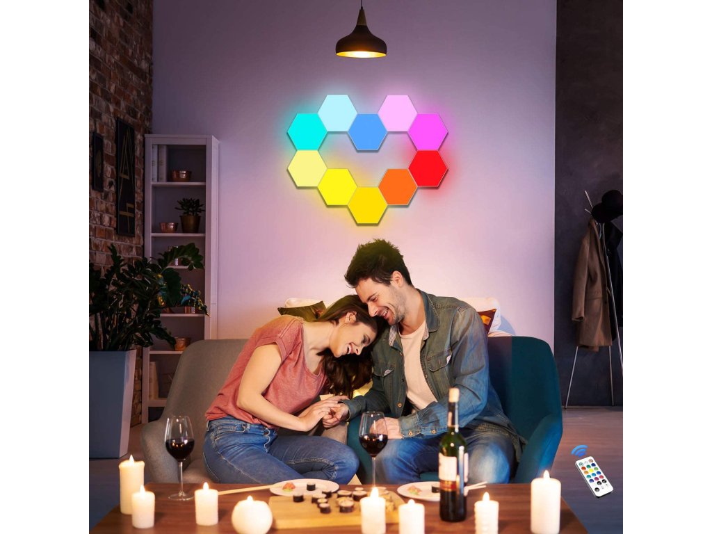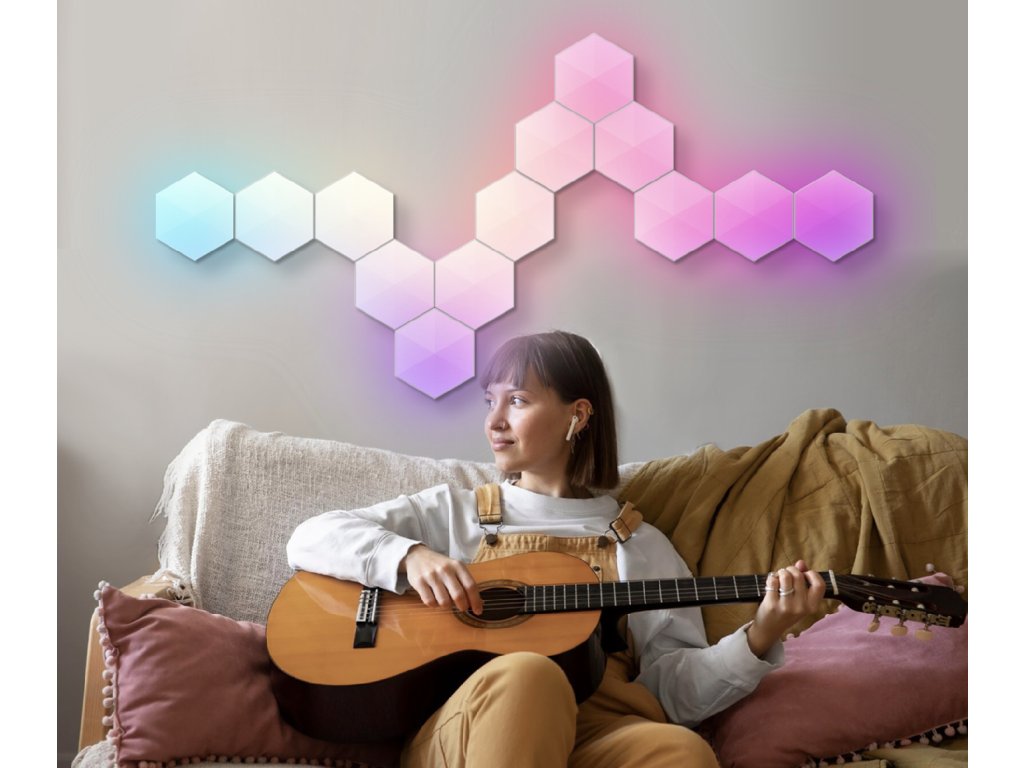Inteligentne oświetlenie ścienne LED z łatwością dopasuje się do Twojej kreatywności. Zestaw zawiera 6 paneli, Wi-Fi, pilot zdalnego sterowania, aplikację mobilną Smart Life / Tuya Smart, kompatybilność z Asystentem Google lub Amazon Alexa.