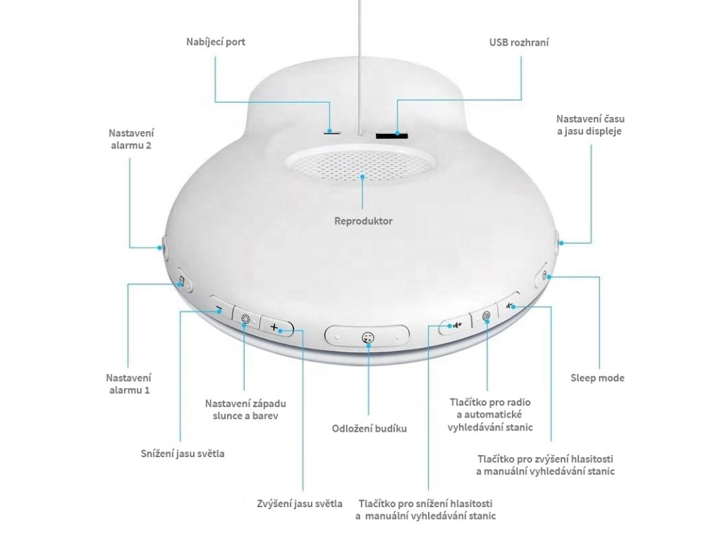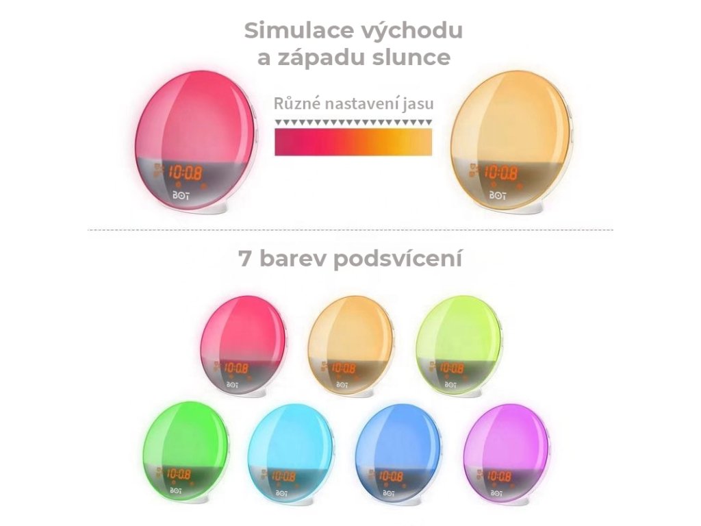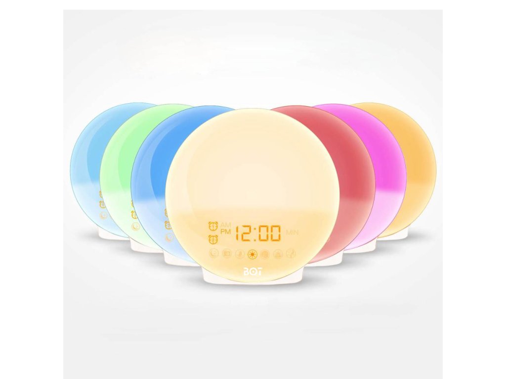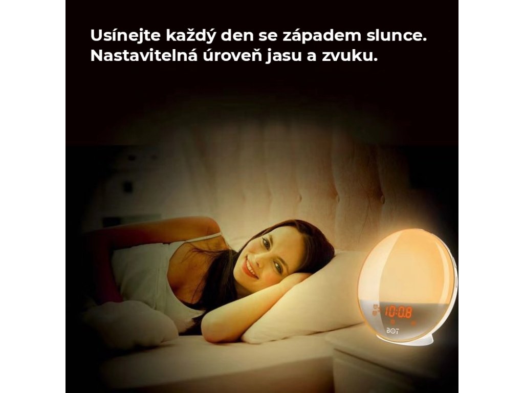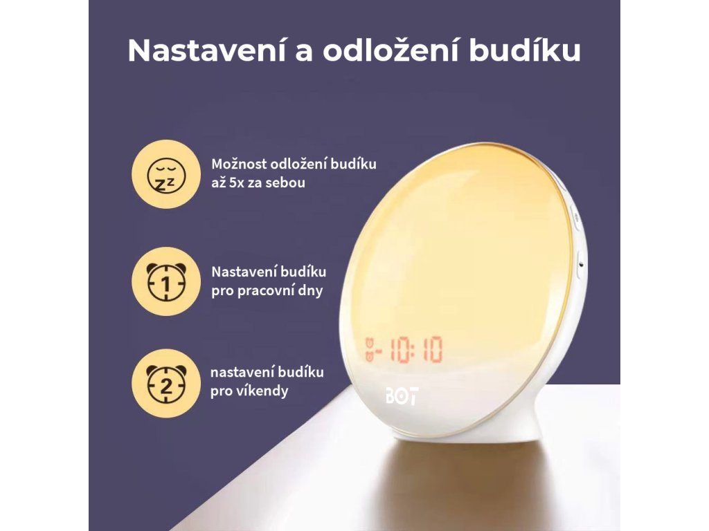 Dzięki możliwości ustawienia do 7 różnych kolorów, inteligentny budzik dopasuje się do niemal każdego pomieszczenia i idealnie wpasuje się w jego wnętrze. Oprócz koloru, możesz również ustawić jasność wybranego światła oraz timer. Możesz ustawić powolne włączanie światła na 10 do 60 minut przed zaplanowanym porannym budzikiem, a inteligentny budzik może również imitować wschód i zachód słońca, dzięki czemu zaśniesz z uczuciem zachodu słońca. Samo przebudzenie może być połączone z 7 rodzajami klasycznej melodii lub dźwiękami z funkcji FM. Dodatkowo możliwe jest również słuchanie radia po przebudzeniu, ładowanie telefonu przez noc, a jeśli nie chce się wstawać, nawet przestawianie budzika.