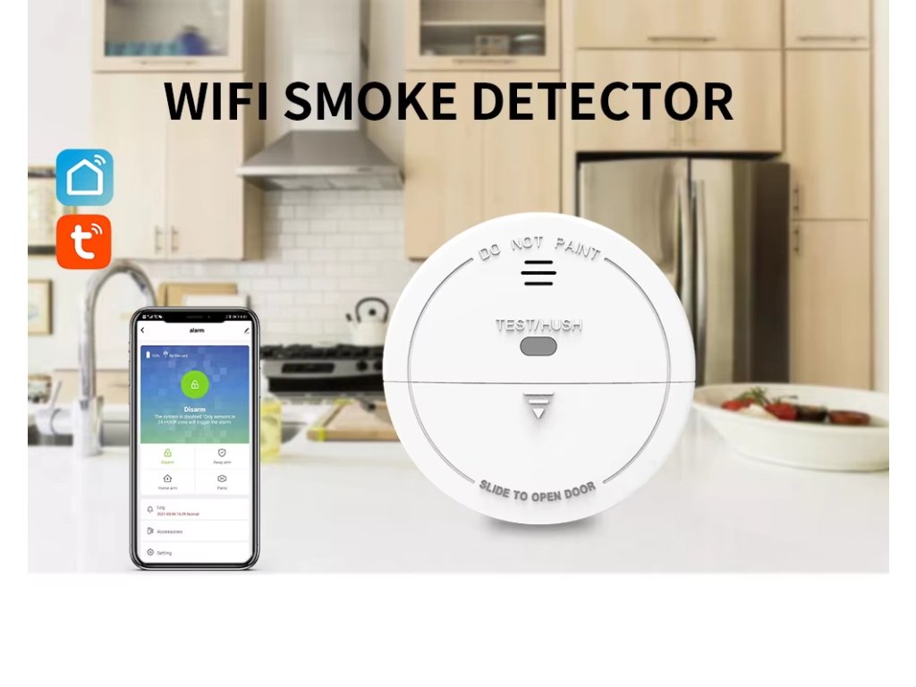 CInteligentny czujnik dymu, Wi-Fi 2,4 GHz, alarm akustyczny 85 dB, aplikacja mobilna Tuya Smart / Smart Life, ostrzeżenie o niskim poziomie baterii, biały design.