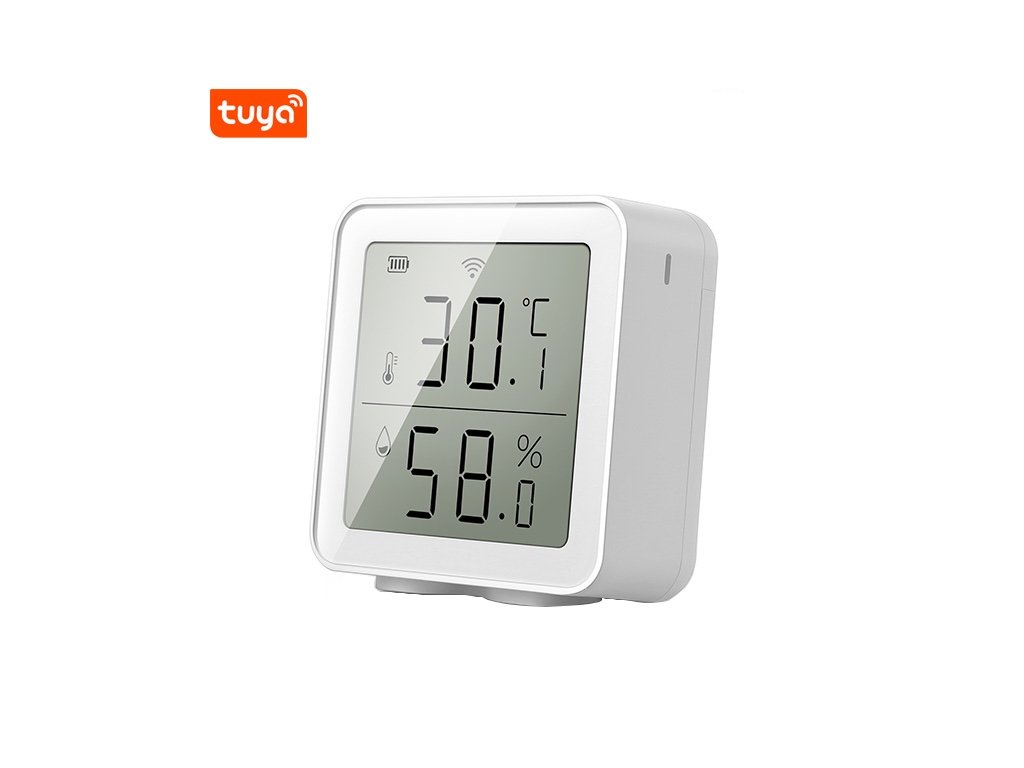 Inteligentny czujnik temperatury i wilgotności powietrza, Wi-Fi, aplikacja mobilna Tuya Smart / Smart Life, kompatybilny z asystentami głosowymi Google Assistant i Amazon Alexa, łatwy w użyciu, biały design.