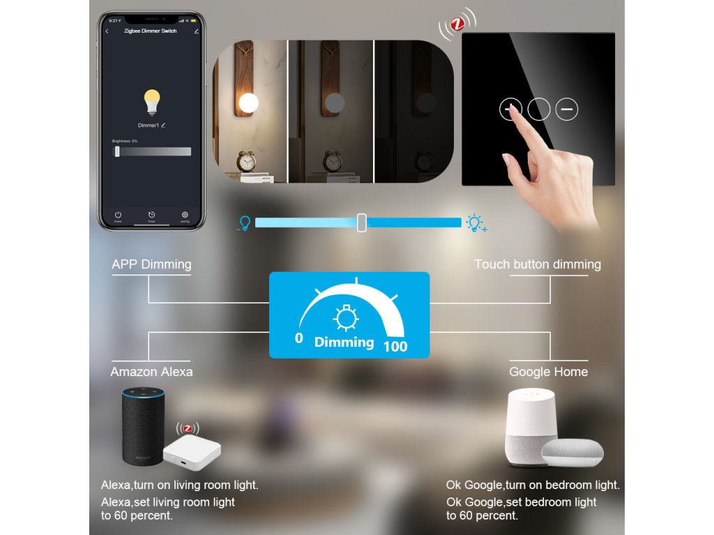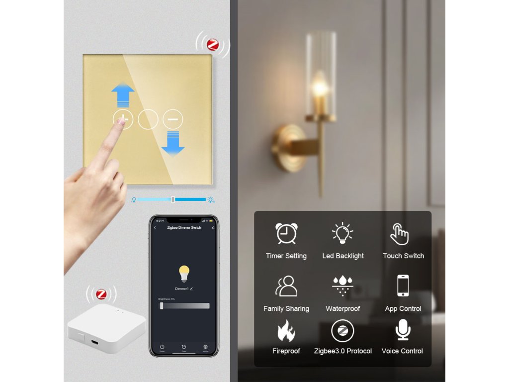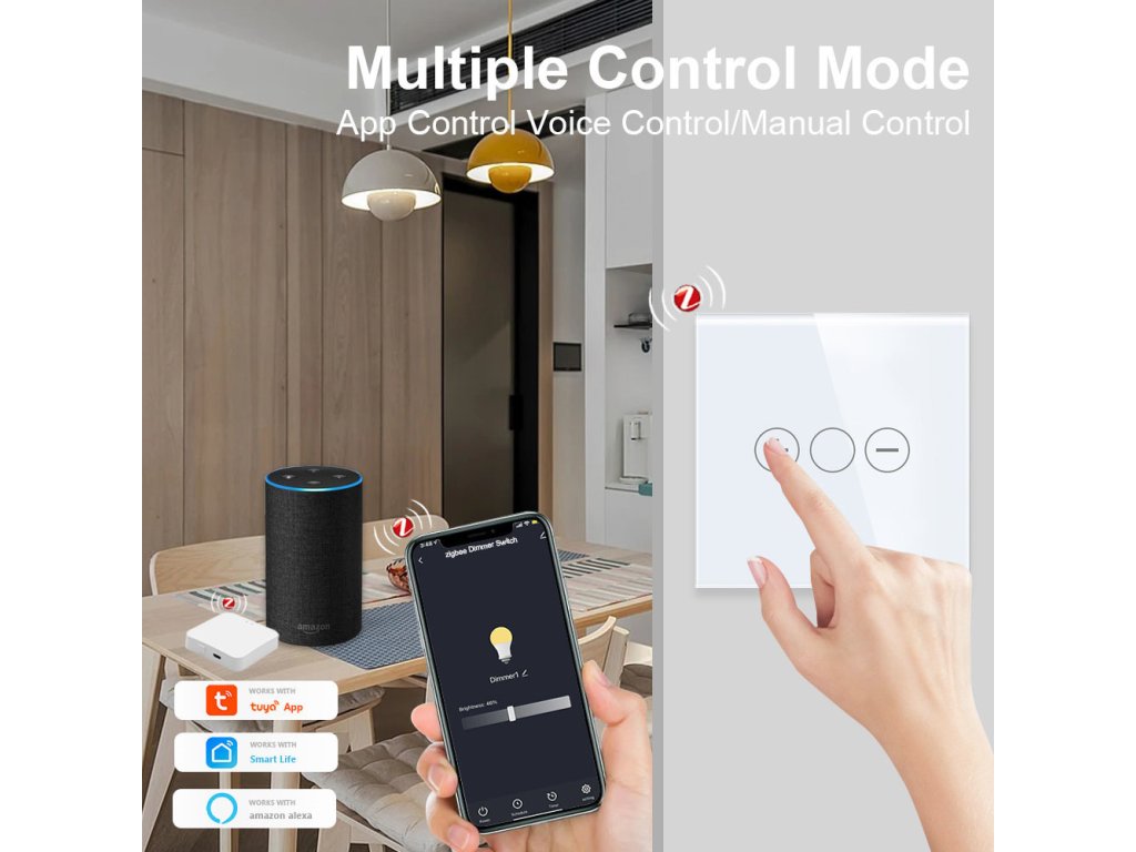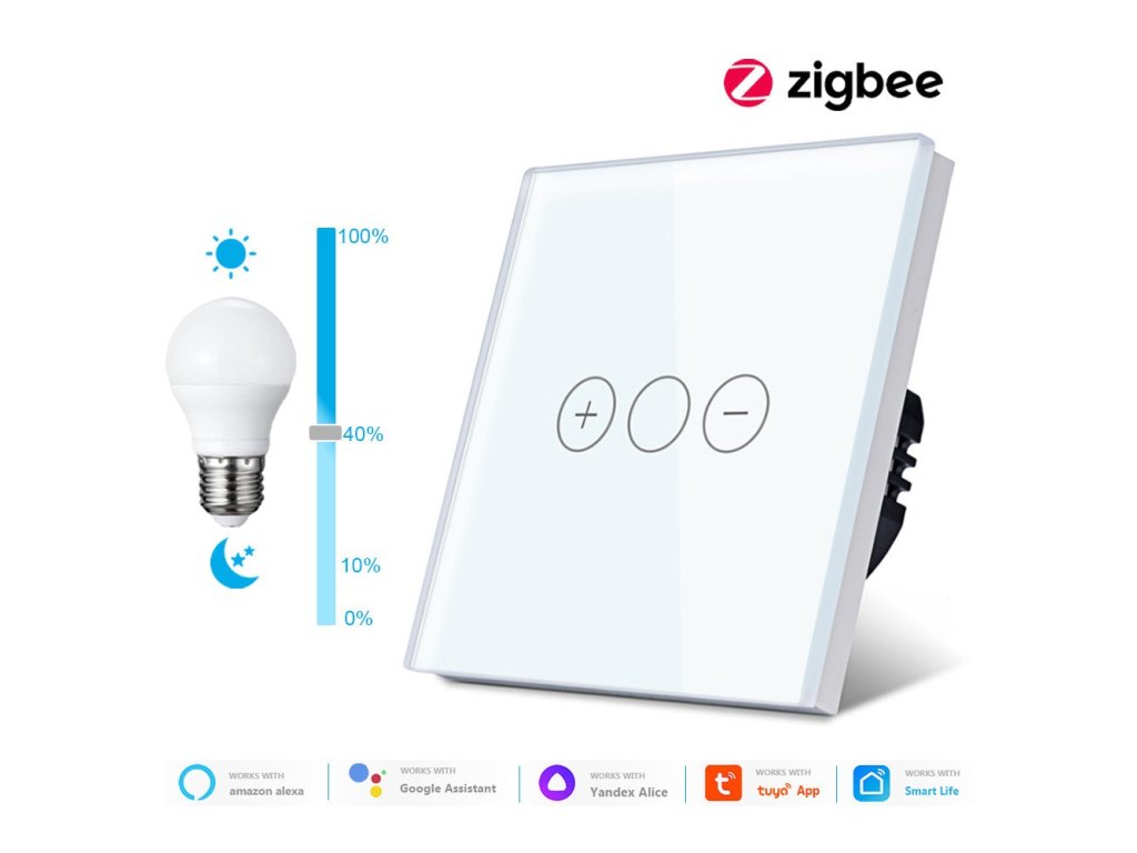 Ściemniacz wyposażony jest w trzy przyciski dotykowe z dyskretnym podświetleniem, co zapewnia komfortową obsługę w ciemności. Biała wersja stylowo wpasowuje się w każde wnętrze. Umożliwia on ustawienie automatycznych scenariuszy włączania i wyłączania oświetlenia, zwiększając tym samym komfort i efektywność energetyczną domu. Dzięki połączeniu przez Zigbee jest idealnym wyborem dla inteligentnych domów z centralną jednostką sterującą (hub). Technologia Zigbee zapewnia stabilną i szybką komunikację, doskonały zasięg sygnału nawet przy wielu urządzeniach, a jednocześnie odciąża domową sieć Wi-Fi – doskonałe rozwiązanie dla większych i bardziej zaawansowanych systemów inteligentnego domu.
