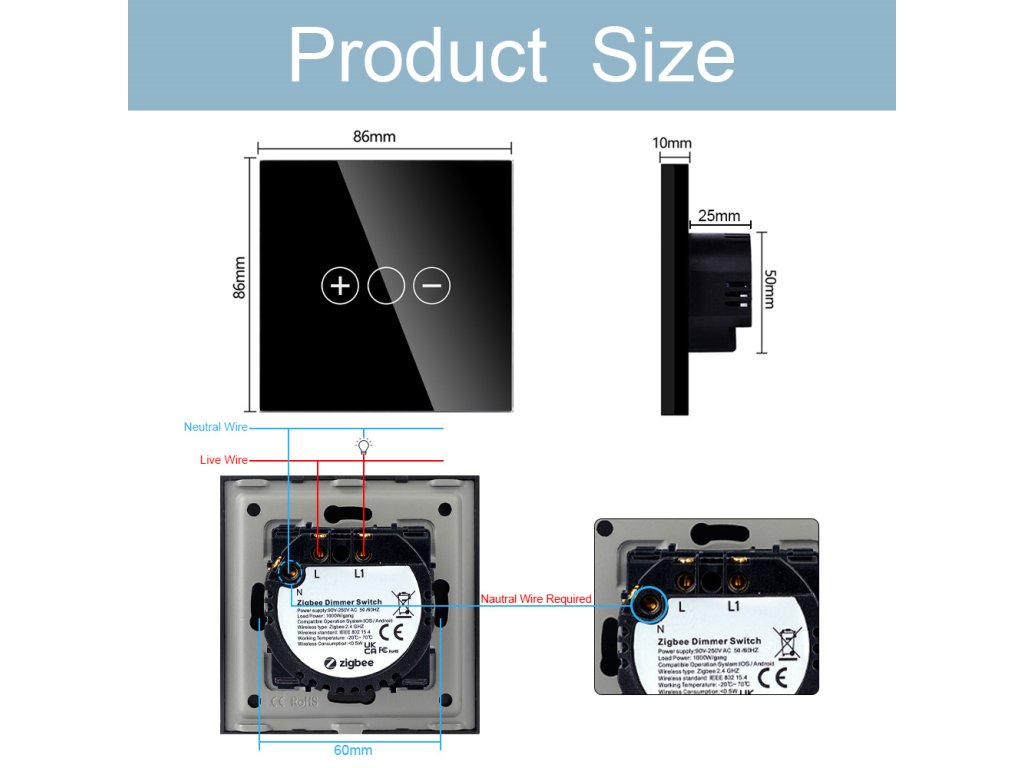 Ze względów bezpieczeństwa i prawidłowego montażu wymagane jest co najmniej 3 Przewody w skrzynce rozdzielczej w pobliżu przełącznika – faza zasilania, faza do światła i niebieski roboczy przewód środkowy „zero”. Nieuprawnione postępowanie może prowadzić do porażenia prądem, a nawet śmierci. Instalacja musi zostać przeprowadzona przez elektryka lub osobę posiadającą ważne uprawnienia do tego zadania.
