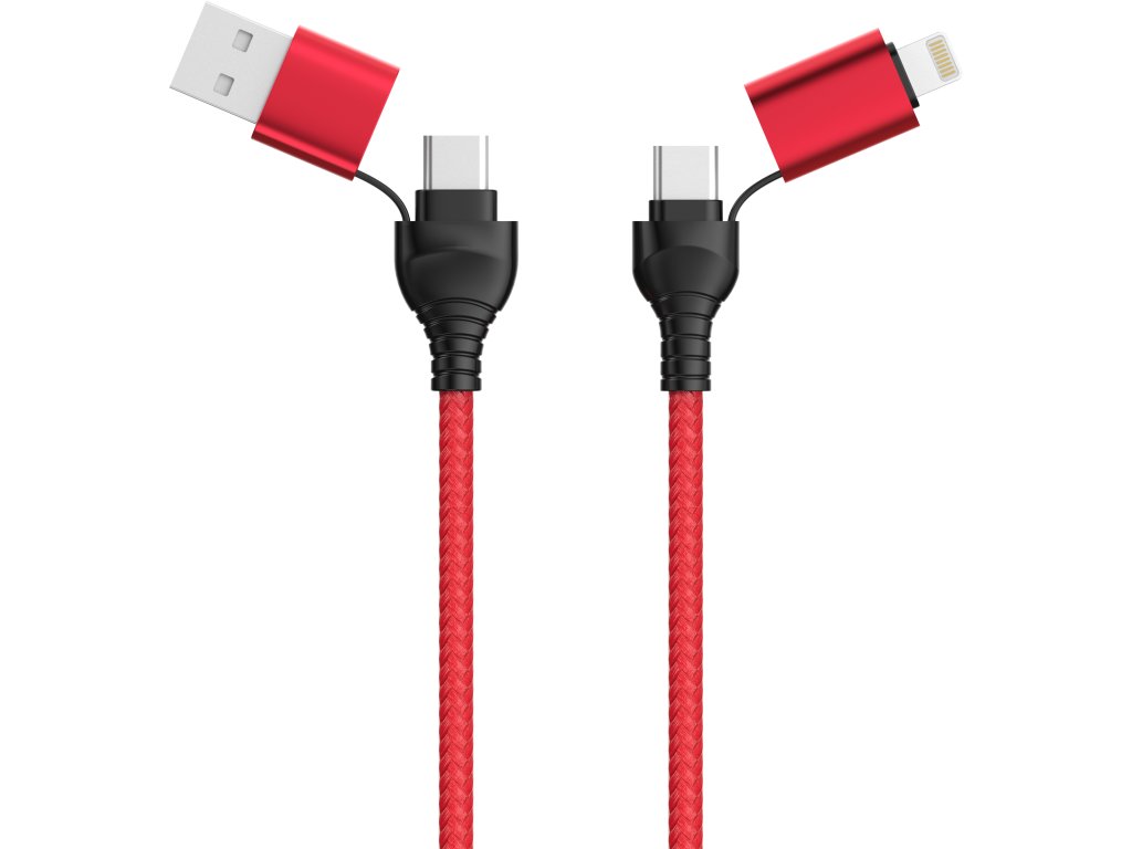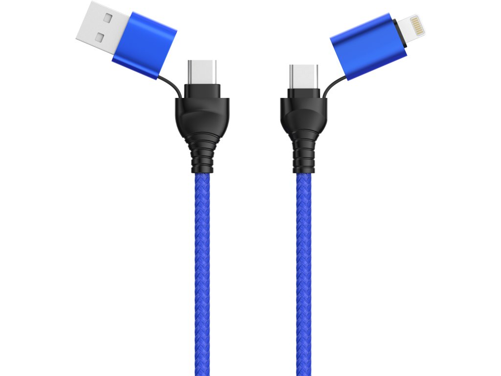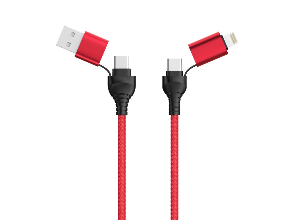 Kabel BOT 4 w 1 do ładowania i przesyłania danych oferuje 4 różne złącza – USB-A/USB-C i USB-C/Lightning. Kabel wykonany jest z wysokiej jakości materiału, a oplot z włókna tekstylnego zapewnia większą odporność na uszkodzenia. Prąd ładowania wynosi 2,4 A. Długość kabla wynosi 1,2 metra. Kabel dostępny jest w 3 kolorach – czarnym, niebieskim i czerwonym.
