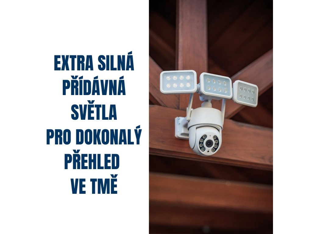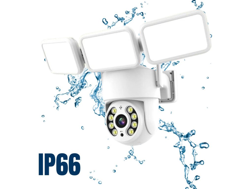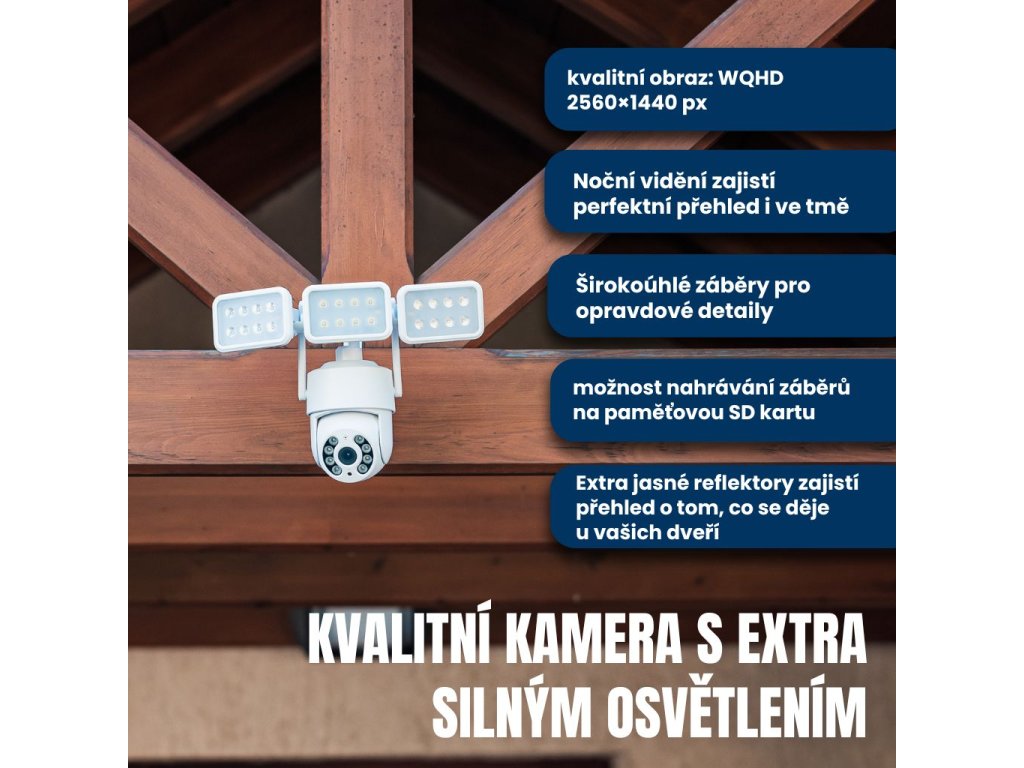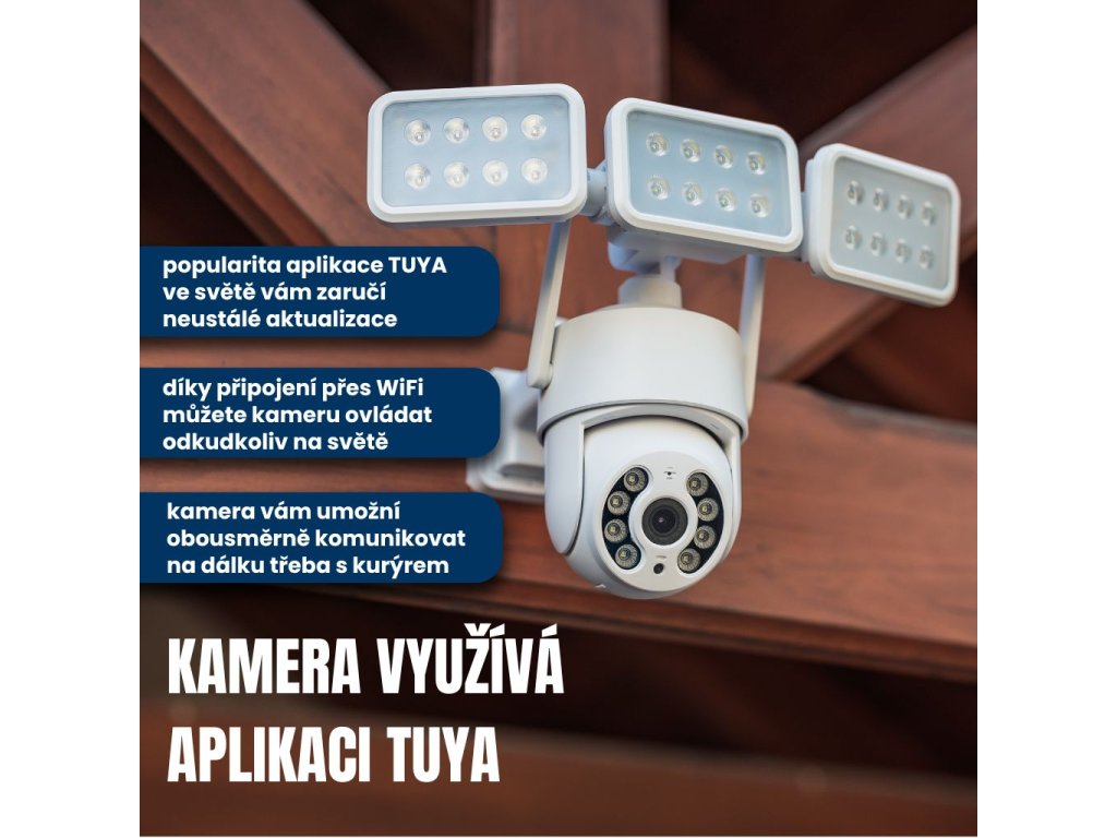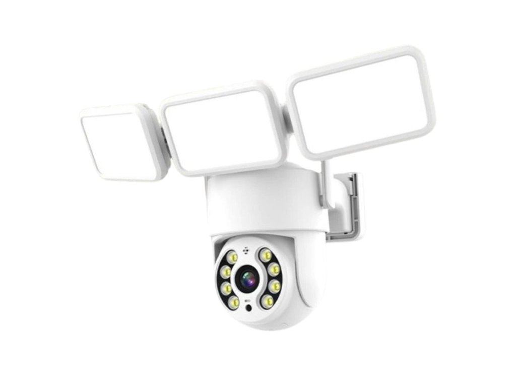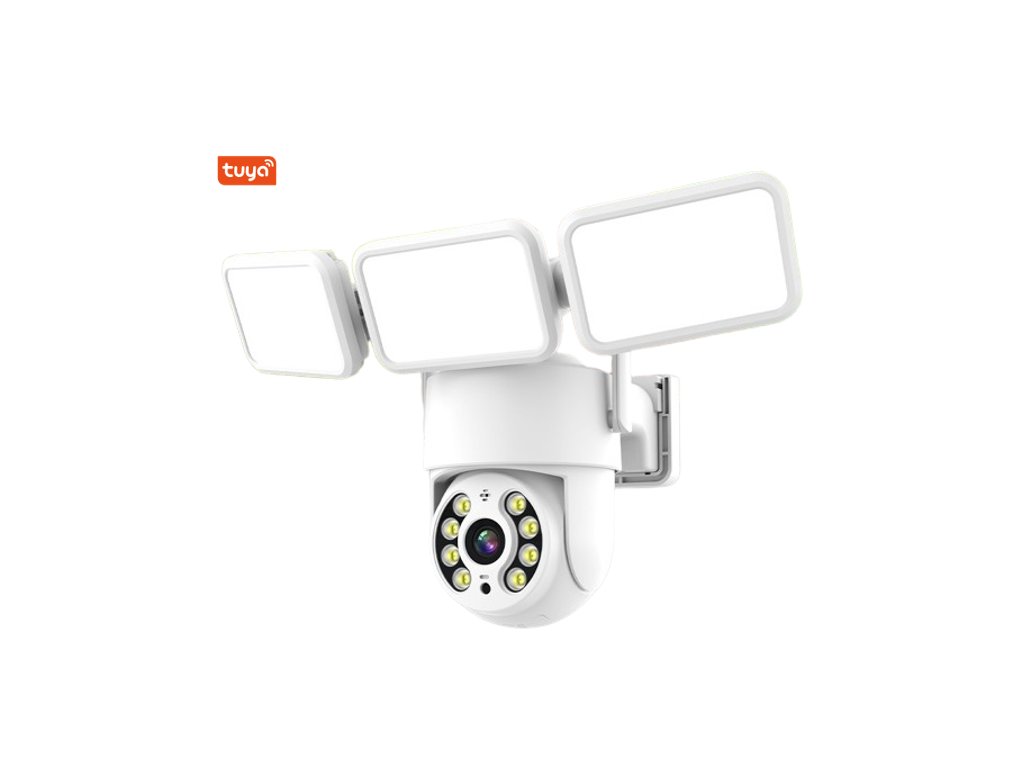 Inteligentna zewnętrzna kamera bezpieczeństwa z reflektorami (reflektor), reflektor 3000 lumenów, detekcja ruchu, 4 MP, rozdzielczość 2560 x 1440 px, Wi-Fi, sterowanie obrotem kamery w poziomie 0°-355° i w pionie 0°-90°, komunikacja dwukierunkowa, Aplikacja mobilna Tuya Smart/Smart Life, biały design.