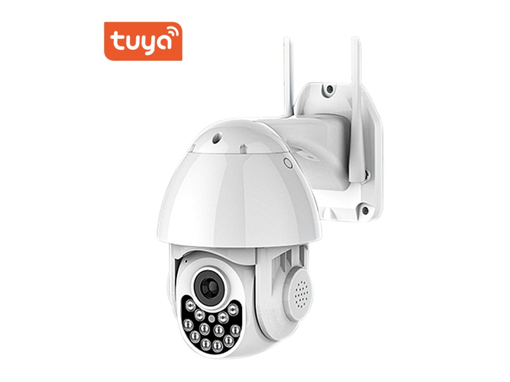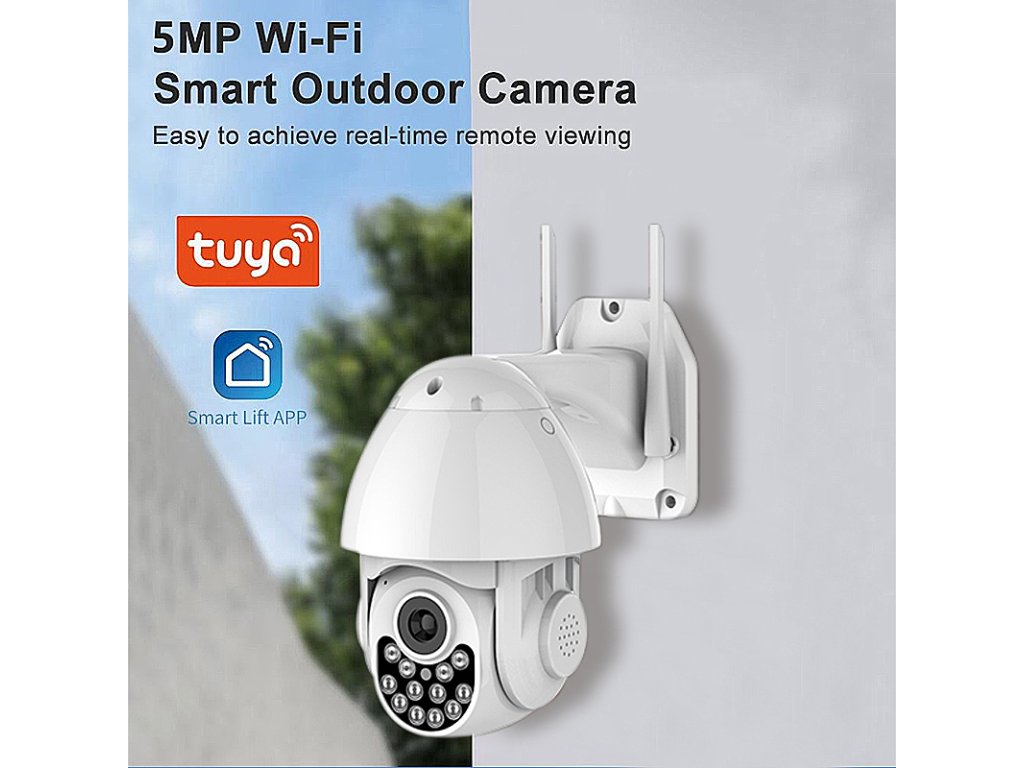 Inteligentna zewnętrzna kamera bezpieczeństwa, detekcja ruchu, 5 MP, rozdzielczość 2592 x 1944 px, Wi-Fi 2,4 GHz, tryb prywatny, sterowanie obrotem kamery w poziomie 0°-355° i w pionie 0°-90°, dwukierunkowa komunikacja z funkcją redukcji szumów, aplikacja mobilna Tuya Smart/Smart Life, biały design.