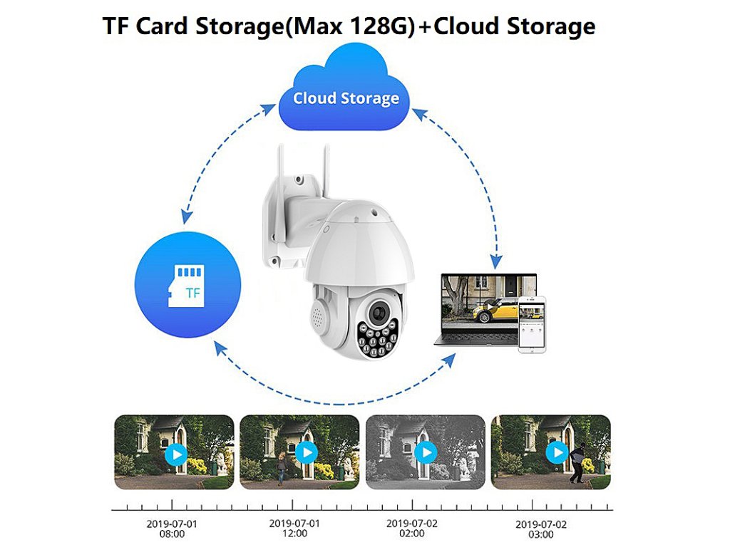 Odporność na warunki atmosferyczne z certyfikatem IP65 gwarantuje niezawodną pracę kamery nawet w trudnych warunkach. Zakres temperatury pracy od -20°C do +55°C obejmuje szeroki zakres klimatyczny, dzięki czemu kamera może być używana przez cały rok. Kamera obsługuje nagrywanie w chmurze lub na karcie microSD (do 128 GB), zapewniając wystarczająco dużo miejsca na przechowywanie ważnych nagrań.