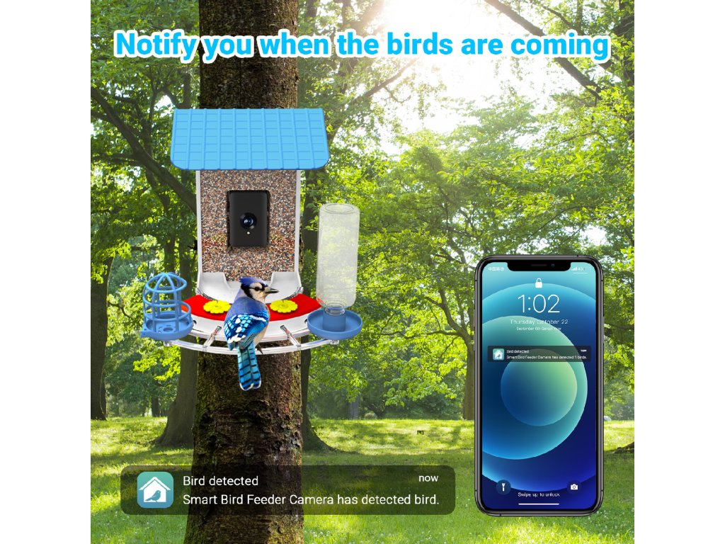 Inteligentny karmnik jest oczywiście kompatybilny z aplikacją mobilną, która umożliwia oglądanie transmisji na żywo i nagrań oraz otrzymywanie powiadomień na telefon natychmiast po wykryciu ruchu.Cała technologia jest przewodowa. Karmnik jest zasilany z gniazdka 230 V.