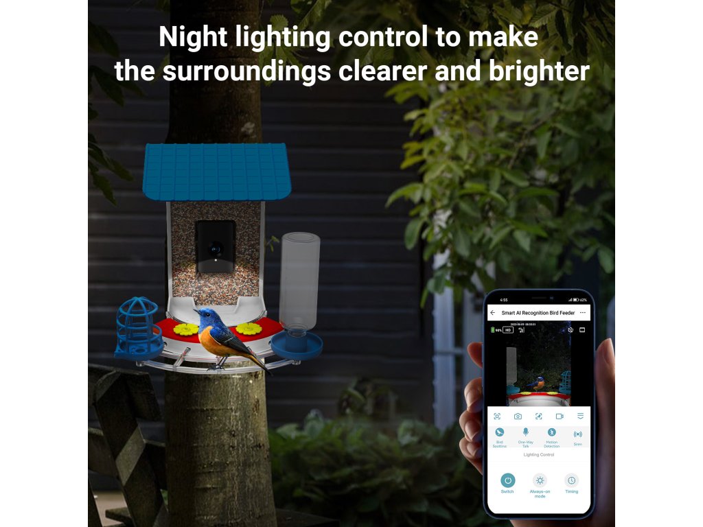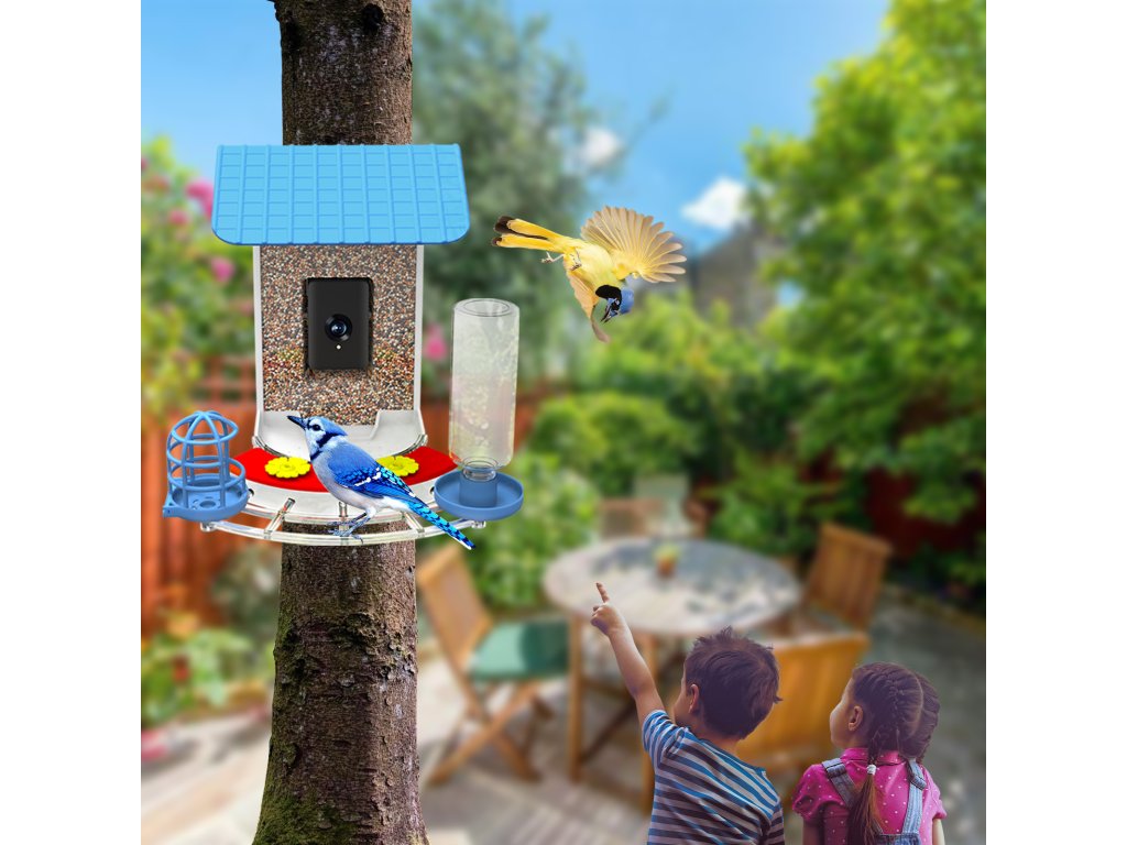 Inteligentny karmnik dla ptaków WiFi z wbudowaną kamerą, zasilaniem 230 V, automatycznym rozpoznawaniem gatunków ptaków, aplikacją mobilną Bird Lover/Tuya Smart, powiadomieniem o wykryciu ruchu, transmisją w czasie rzeczywistym i nagrywaniem. Karmnik dostarczany jest bez klatki i pojemnika na karmę.