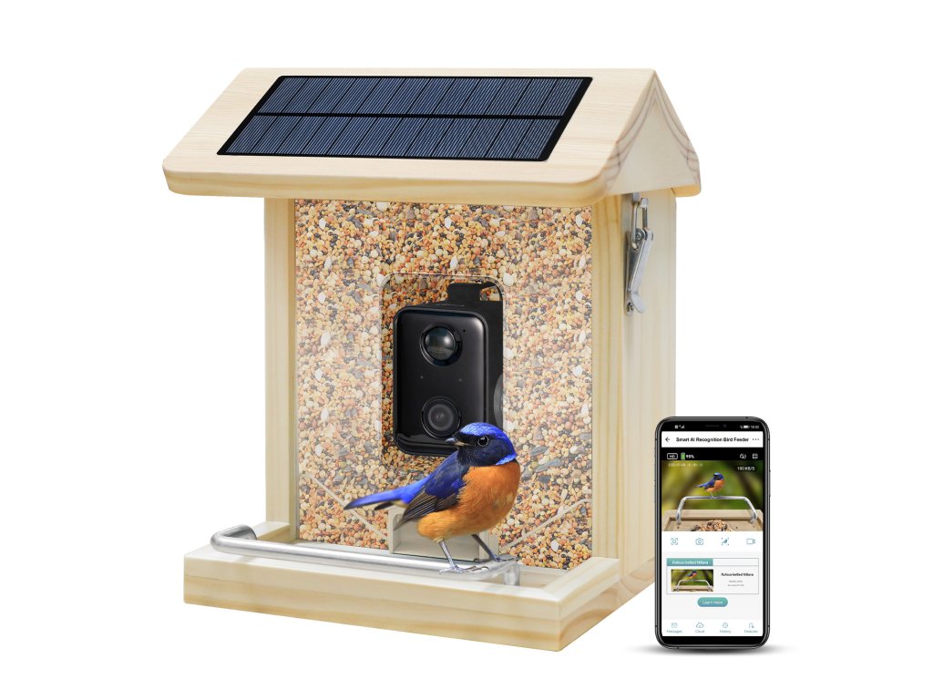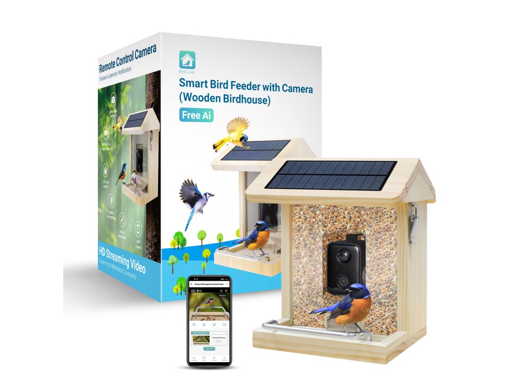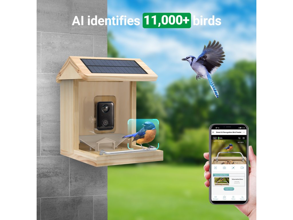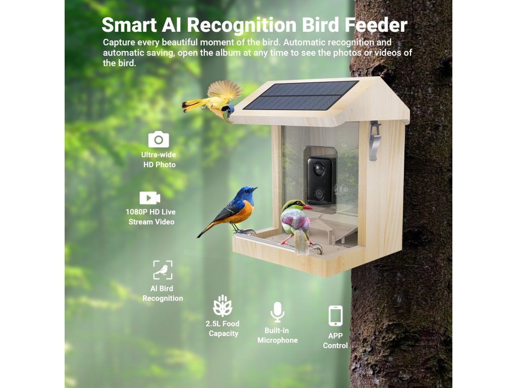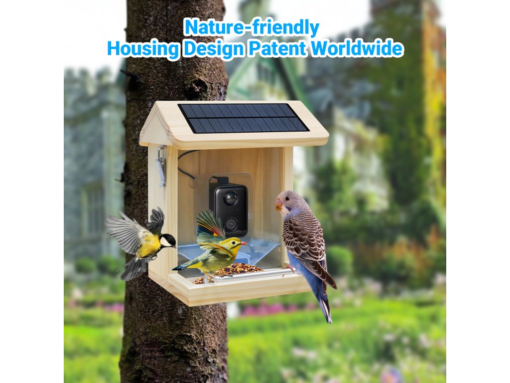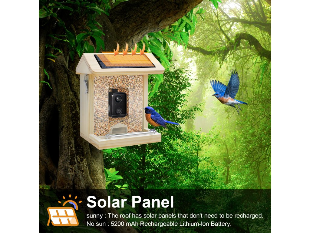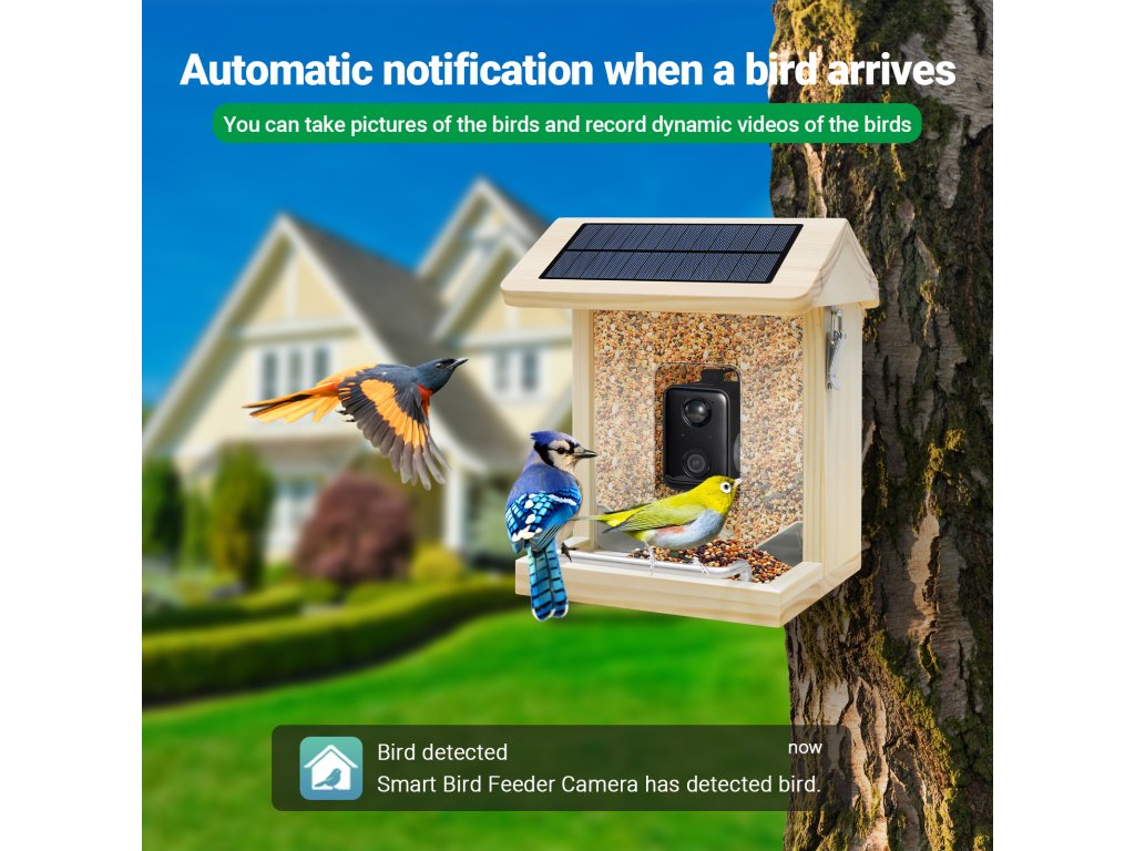 Inteligentny karmnik dla ptaków WiFi z wbudowaną kamerą z ładowaniem słonecznym, automatyczne rozpoznawanie gatunków ptaków, bezprzewodowa konstrukcja, aplikacja mobilna Bird Lover / Tuya Smart, powiadomienie o wykryciu ruchu, materiał: drewno, transmisja w czasie rzeczywistym, nagrywanie.