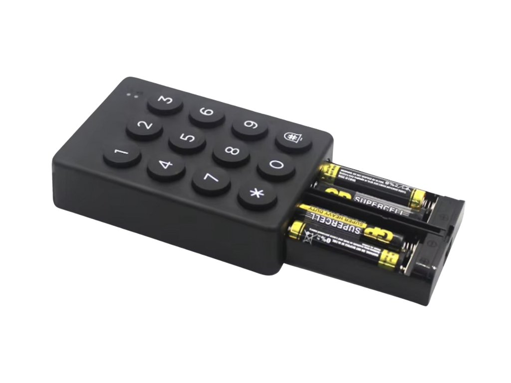 Klawiatura bezprzewodowa, Bluetooth, aplikacja mobilna TTLock, prosty dostęp za pomocą kodu numerycznego, kompatybilność z inteligentnymi urządzeniami TTLock, zasilanie 4 bateriami AAA, czarny design.