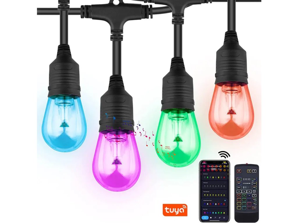Zabawny łańcuch LED (15 żarówek) sterowany bezprzewodowo, RGBCW, moc 12 W, WiFi, Bluetooth, Tuya Smart, pilot zdalnego sterowania, do 16 milionów kolorów, timer, zmienia kolory w rytm muzyki, regulowana jasność i kolory, żywotność 20 000 godzin, odporność zgodna z IP65, długość 15 metrów